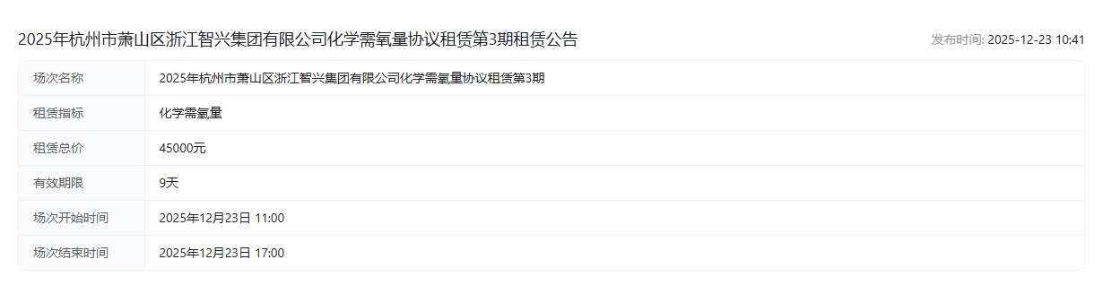 2025年杭州市萧山区浙江智兴集团有限公司化学需氧量协议租赁第3期租赁公告交易公告