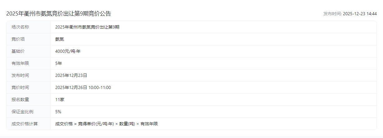 2025年衢州市氨氮竞价出让第9期竞价公告交易公告