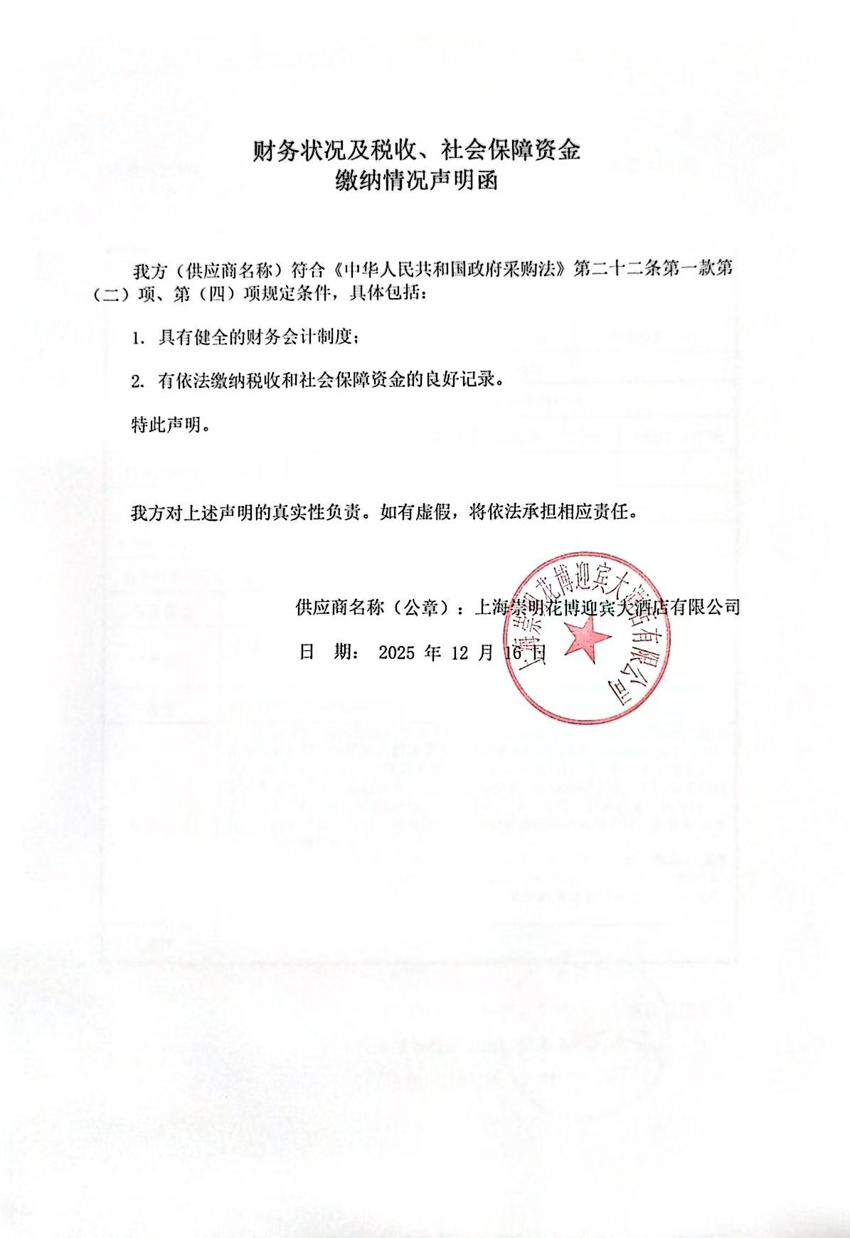 财税状况、社保缴纳声明函:财务状况及税收、社会保障金缴纳声明函.*** **元
