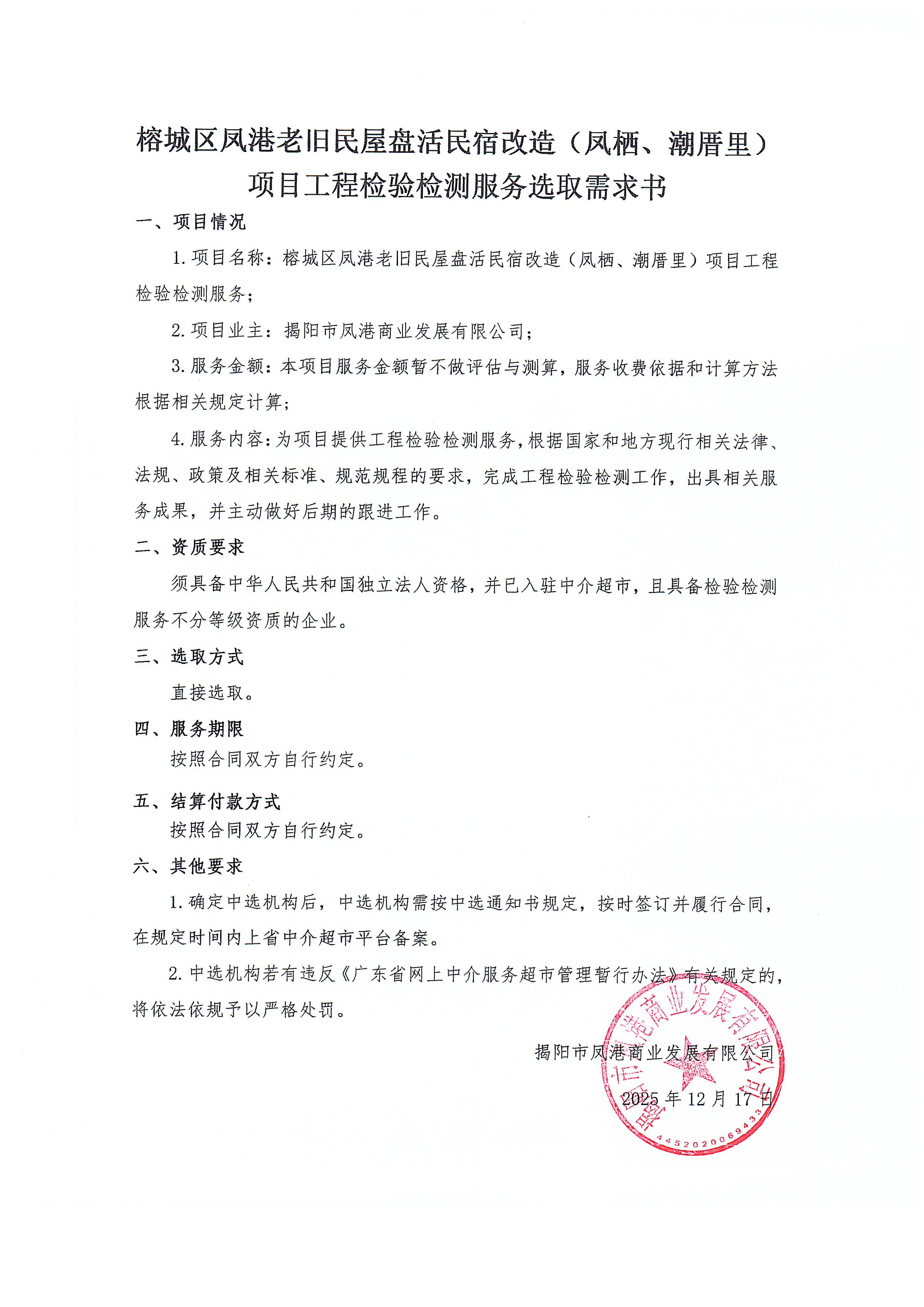 关于为【榕城区凤港老旧民屋盘活民宿改造(凤栖、潮厝里)项目工程检验检测服务】公开选取【检验检测服务】机构的公告