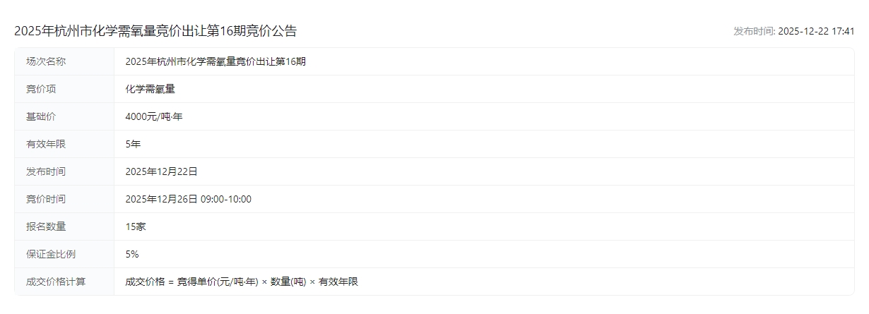 2025年杭州市化学需氧量竞价出让第16期竞价公告