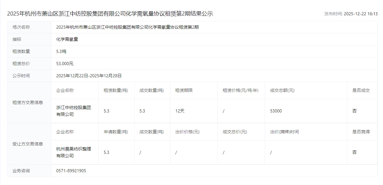 2025年杭州市萧山区浙江中纺控股集团有限公司化学需氧量协议租赁第2期结果公示