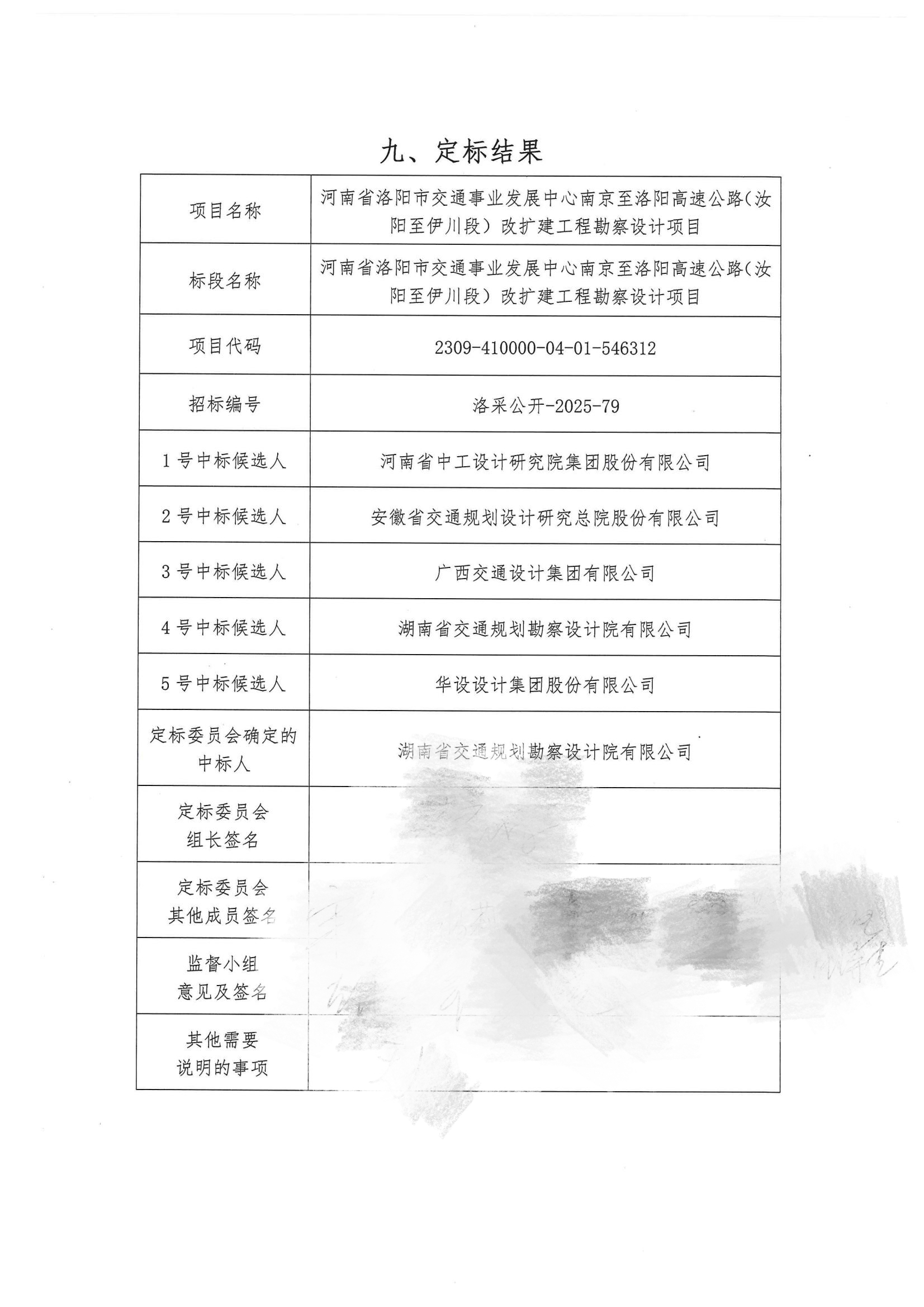 | *.投标人或者其他利害关系人对本结果有异议的,在公示期内利用交易系统线上向招标人或招标代理机构提交异议函(并签盖法定代表人及单位电子公章),委托他人提出异议的,需一并提交授权委托书和授权委托人身份证明的电子件。逾期未提交或未按照要求提交的异议函将不予受理。 *.中标结果公示期满次日即为中标通知书领取日。公示期满后*个工作日内,被授权的中标人代表应到代理机构(或招标人)指定地点及时领取中标通知书,逾期未领取的,视同领取日已领取。中标人应按照规定的时限和程序与招标人完成合同的签订。 *.本次招标将通过“洛阳市电子招投标交易平台”(********.**.***.**),向中标人发出电子中标通知书,中标人可网上登录交易平台后自行打印。该中标通知书加盖有招标代理机构的电子签章。 *.定标情况(详见附件) 定标日期:****年**月**日 定标地点:洛阳市公共资源交易中心定标四室 定标方法:核查随机法 中标人名称:湖南省交通规划勘察设计院有限公司 比较优势:本项目采用核查随机法,通过随机抽取的方式确定中标人。 *.监管部门:洛阳市交通运输局 监管部门联系人:洛阳市交通运输局建设管理科 监管部门联系方式:************* | |||||||||||||||||||||||||||||||
