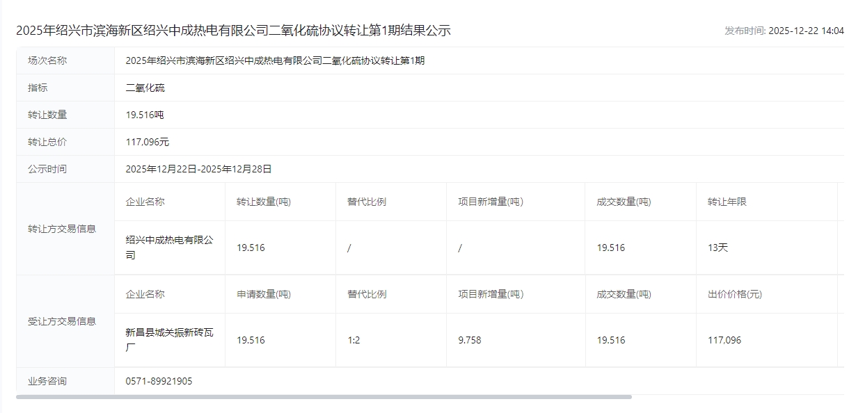 2025年绍兴市滨海新区绍兴中成热电有限公司二氧化硫协议转让第1期结果公示
