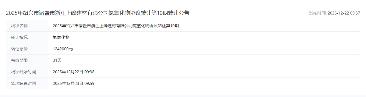 2025年绍兴市诸暨市浙江上峰建材有限公司氮氧化物协议转让第10期转让公告