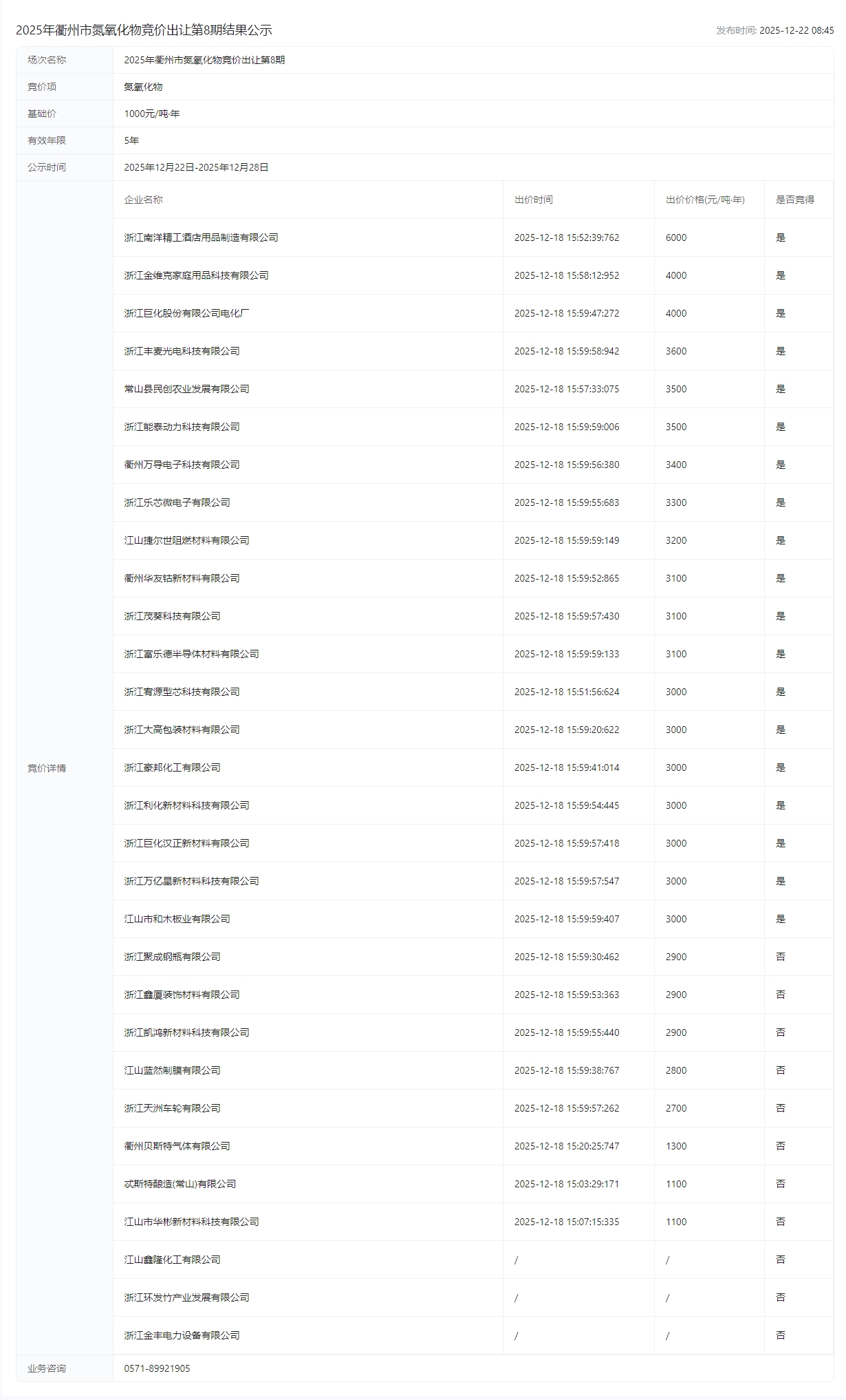 2025年衢州市氮氧化物竞价出让第8期结果公示