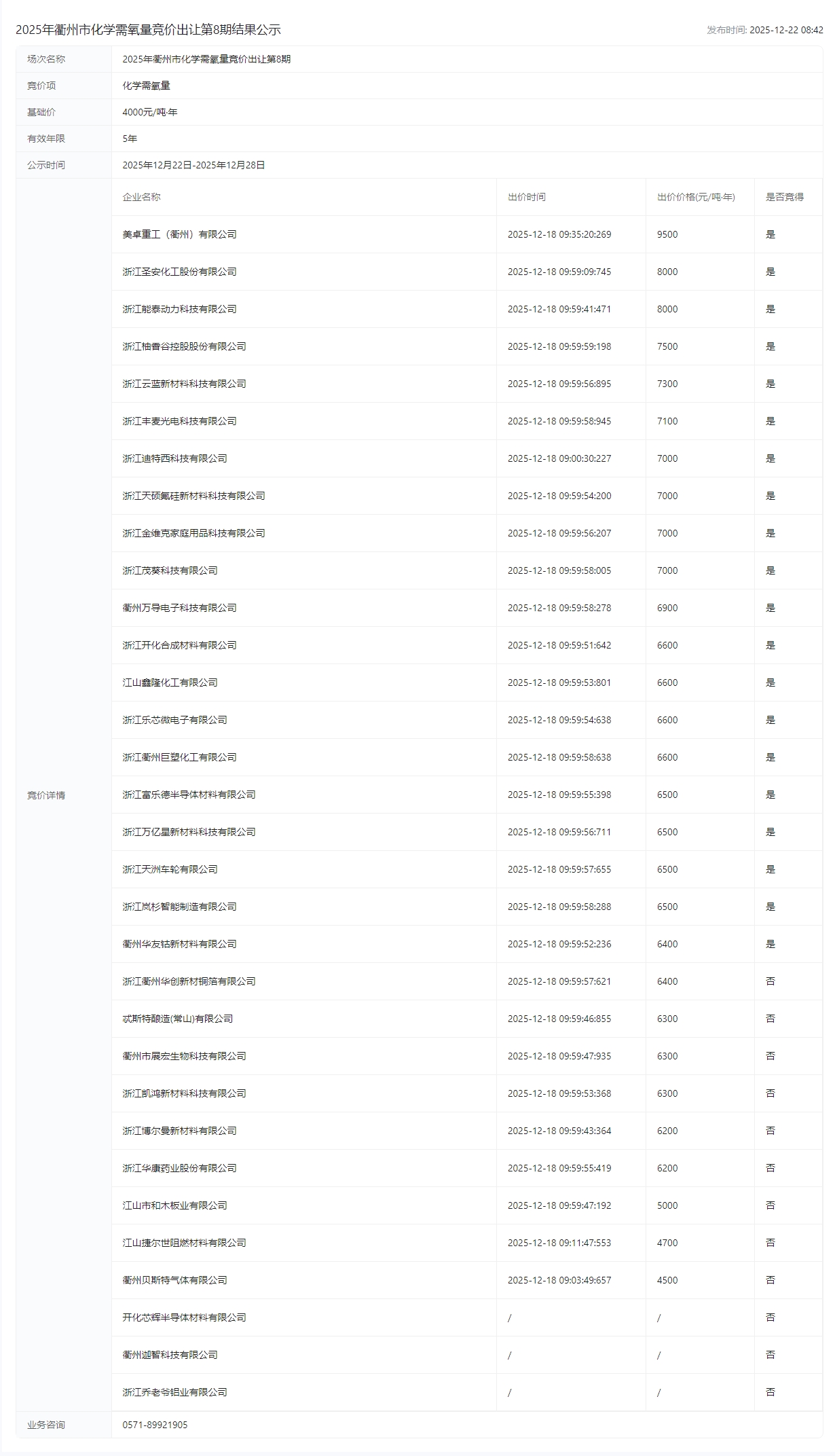 2025年衢州市化学需氧量竞价出让第8期结果公示