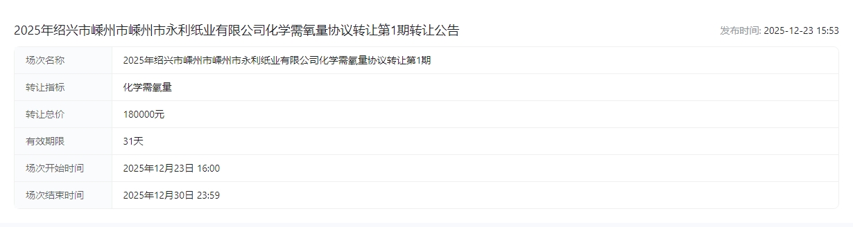 2025年绍兴市嵊州市嵊州市永利纸业有限公司化学需氧量协议转让第1期转让公告