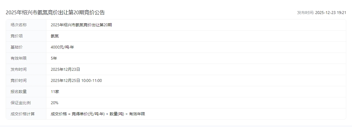 2025年绍兴市氨氮竞价出让第20期竞价公告
