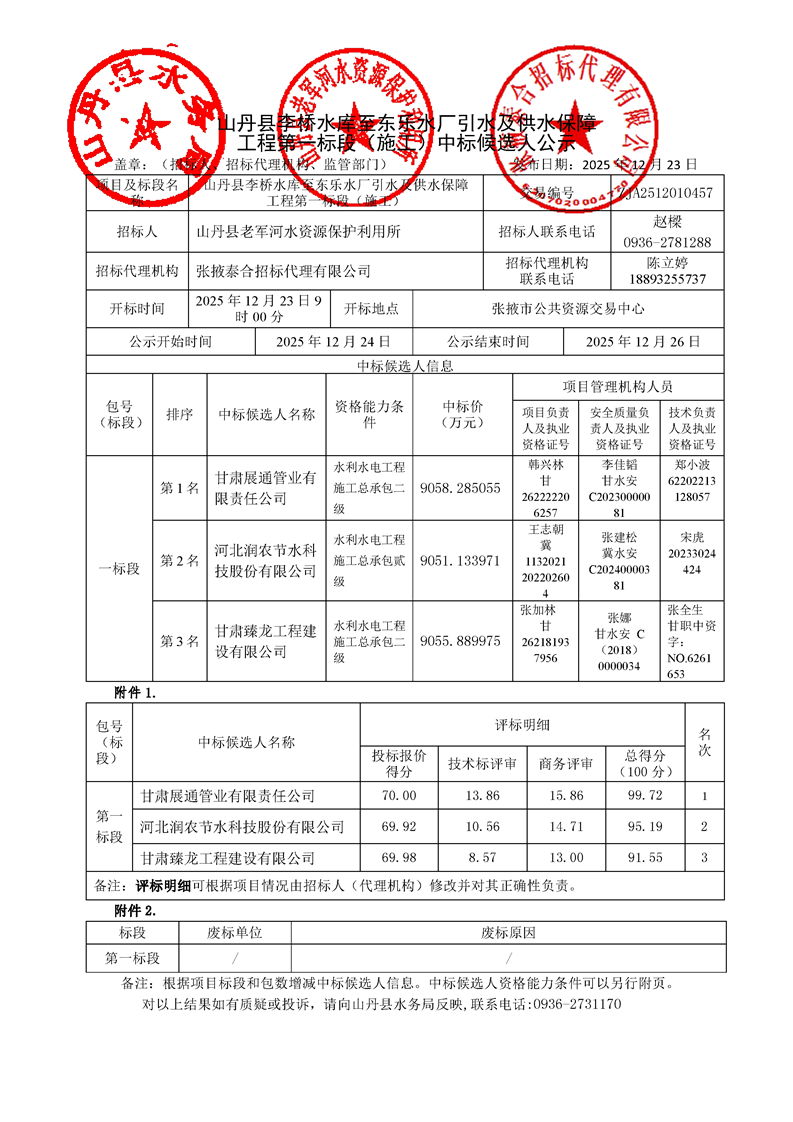 [市本级]山丹县李桥水库至东乐水厂引水及供水保障工程第一标段(施工)中标候选人公示交易结果公示
