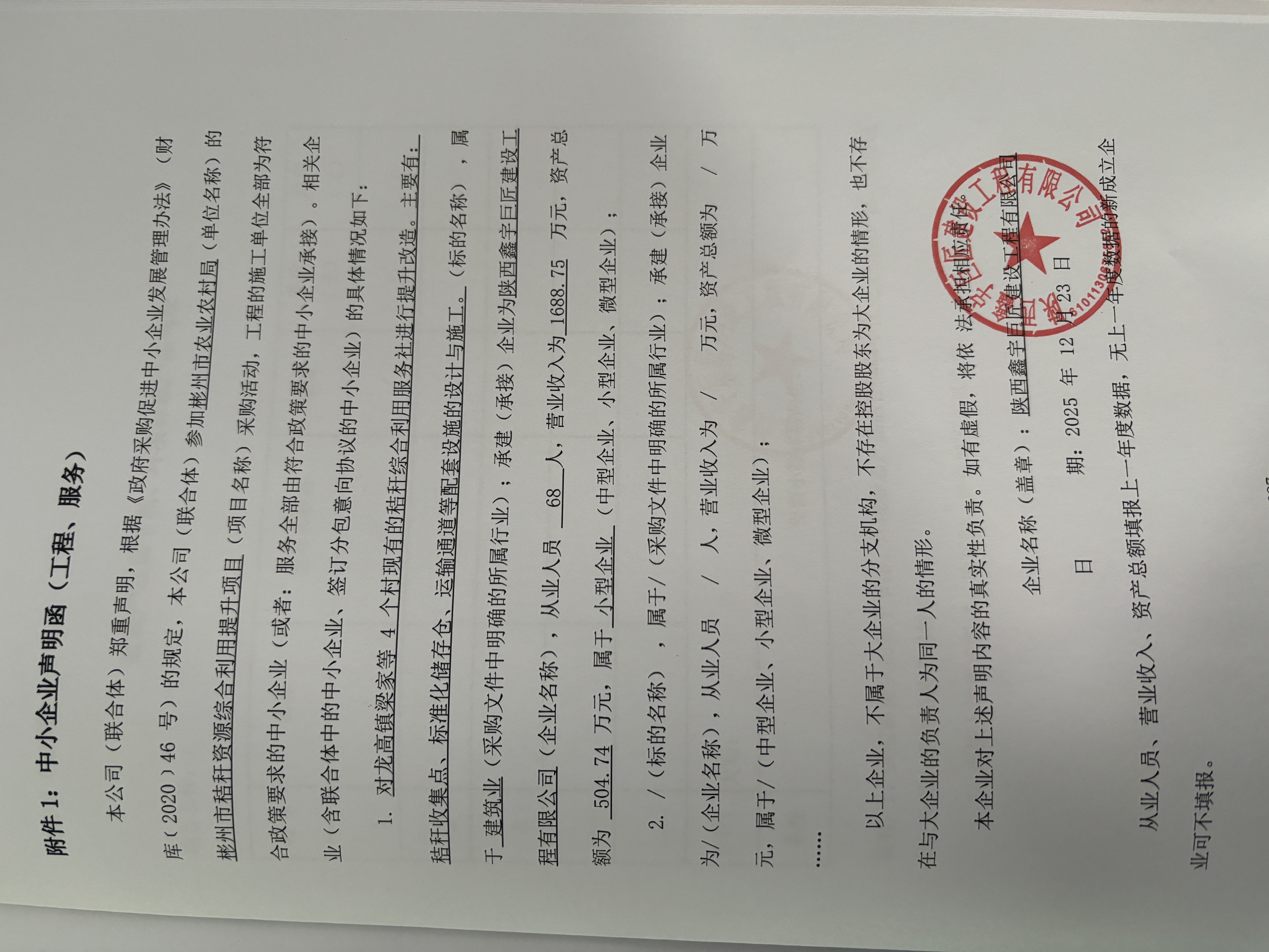 | * | 房屋附属设施施工 | 对龙高镇梁家等*个村现有的秸秆综合利用服务社进行提升改造。主要有:秸秆收集点、标准化储存仓、运输通道等配套设施的设计与施工。 | 招标所发工程量清单全部内容 | 自合同签订之日起**日历天(完成所有项目建设内容且验收合格) | 王鹏 | 陕************ | *,***,***.** |