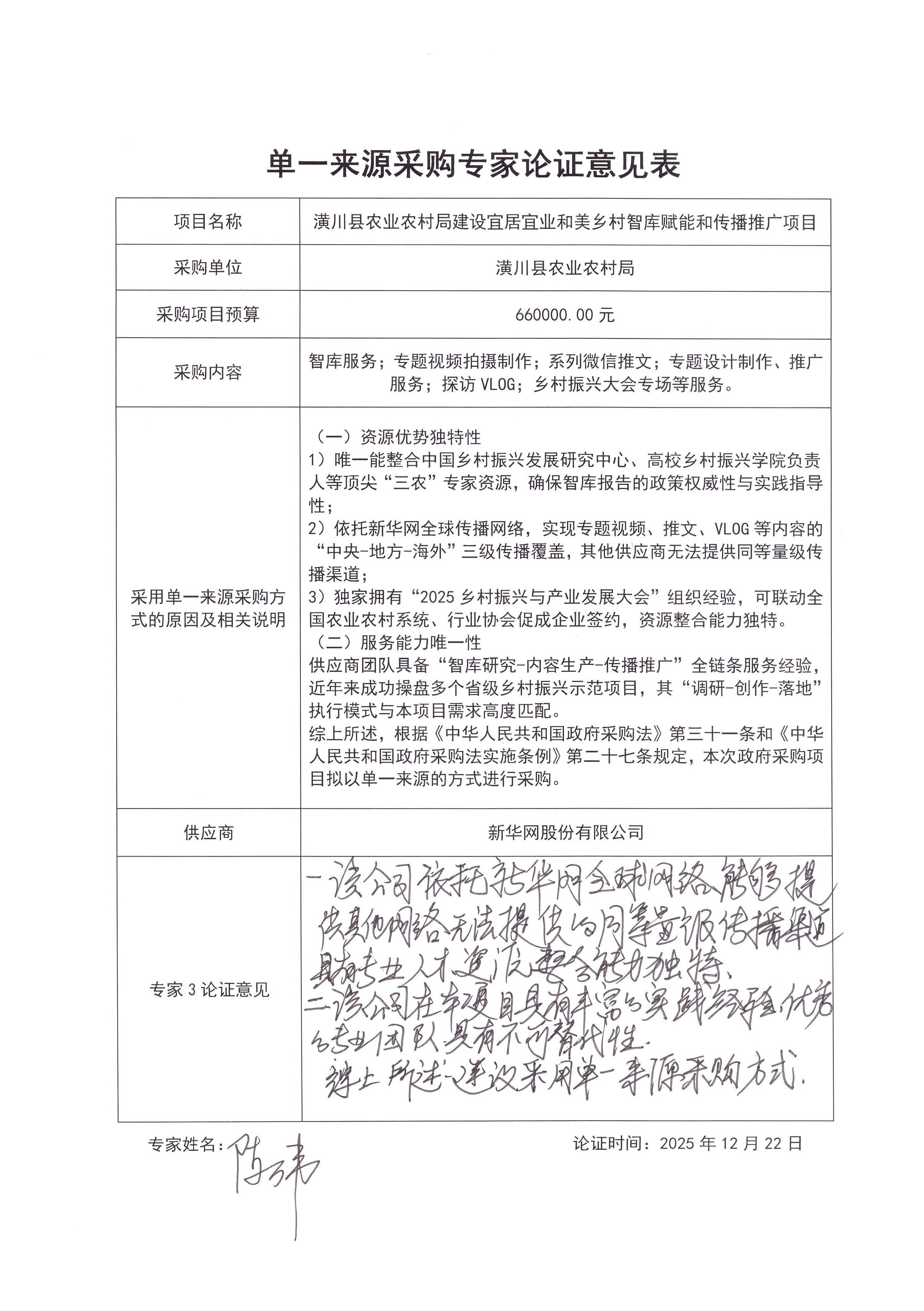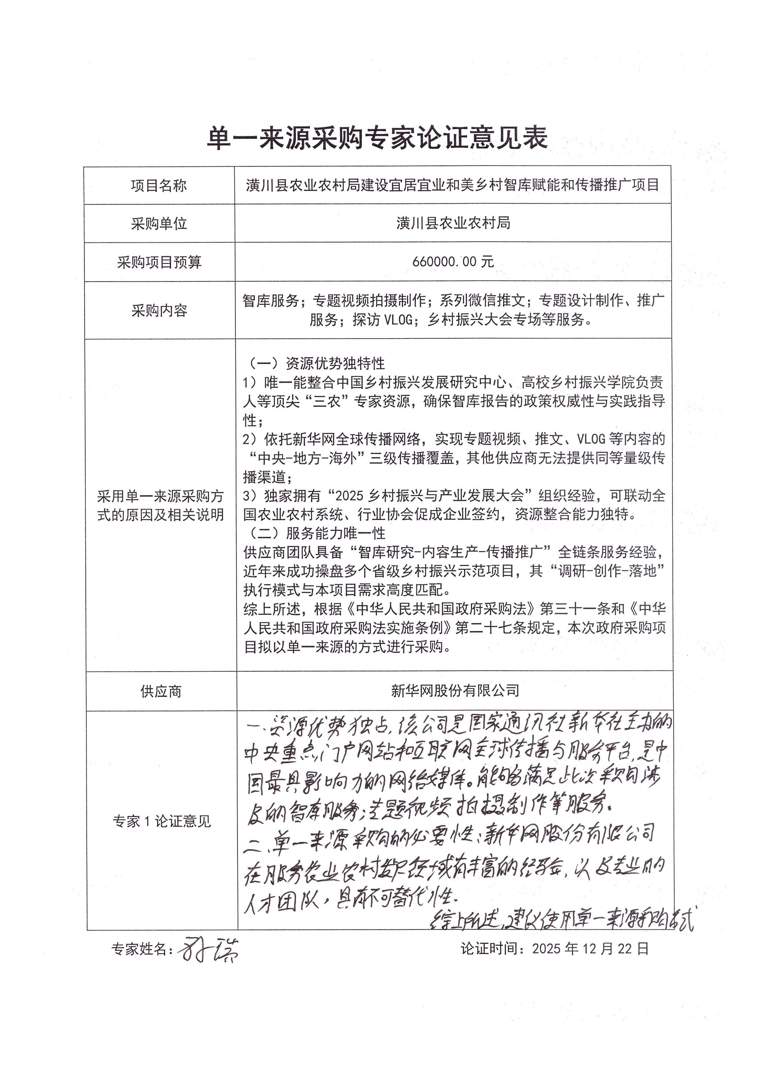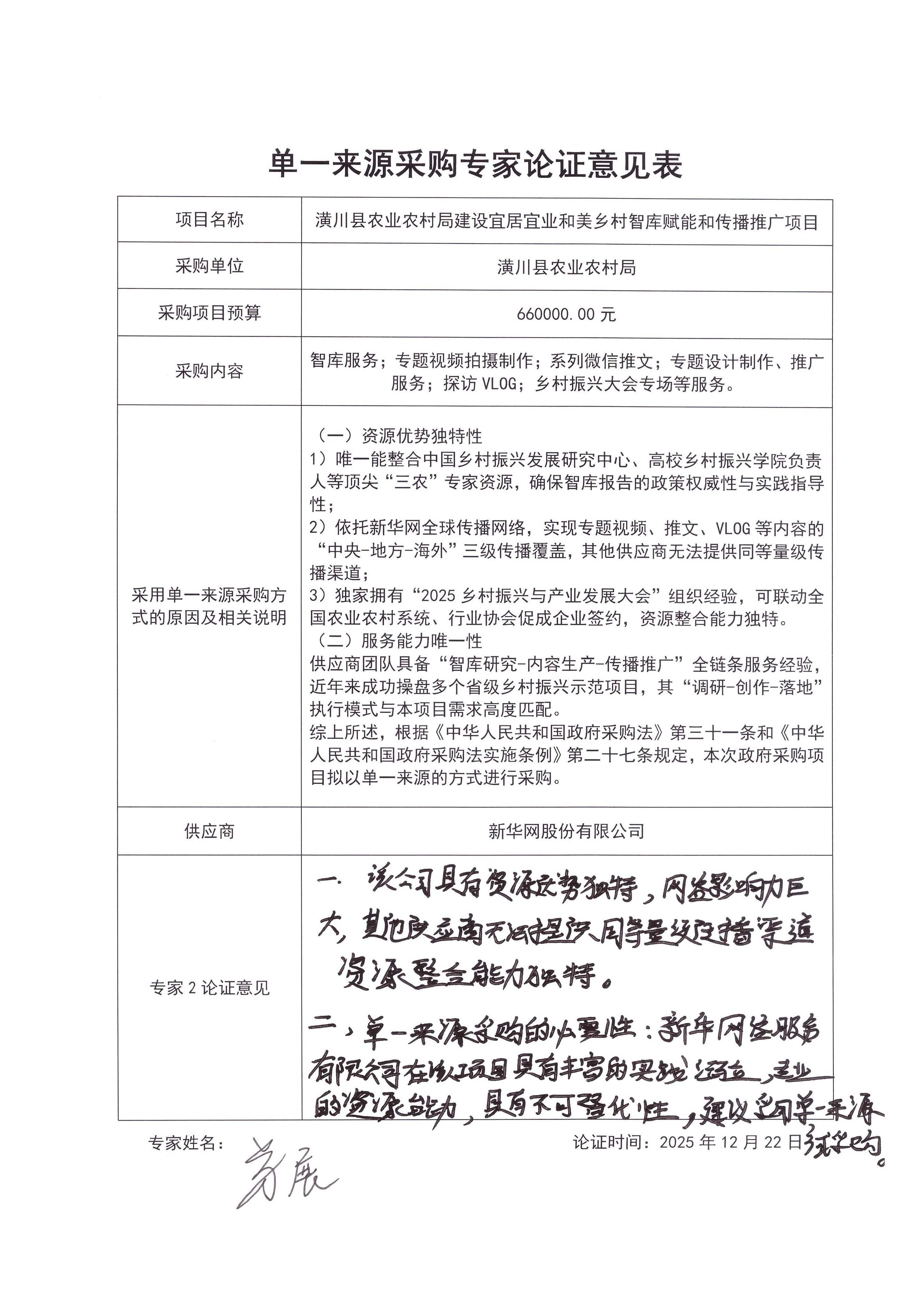 | (一)资源优势独特性 *)唯一能整合中国乡村振兴发展研究中心、高校乡村振兴学院负责人等顶尖“三农”专家资源,确保智库报告的政策权威性与实践指导性; *)依托新华网全球传播网络,实现专题视频、推文、****等内容的“中央*地方*海外”三级传播覆盖,其他供应商无法提供同等量级传播渠道; *)独家拥有“****乡村振兴与产业发展大会”组织经验,可联动全国农业农村系统、行业协会促成企业签约,资源整合能力独特。 (二)服务能力唯一性 供应商团队具备“智库研究*内容生产*传播推广”全链条服务经验,近年来成功操盘多个省级乡村振兴示范项目,其“调研*创作*落地”执行模式与本项目需求高度匹配。 综上所述,根据《中华人民共和国政府采购法》第三十一条和《中华人民共和国政府采购法实施条例》第二十七条规定,本次政府采购项目拟以单一来源的方式进行采购。 | ||||||||||||||||