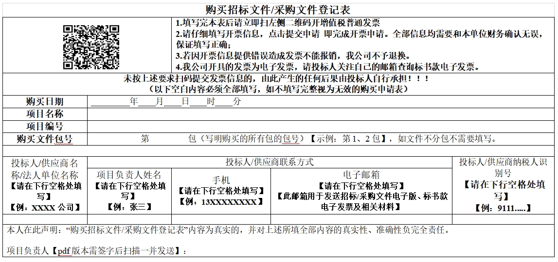 方式:请电汇购买议标文件。议标文件售价为***元人民币,售后不退。有兴趣的供应商可在****年**月**日至****年**月**日期间每个工作日下午**:**(北京时间)前汇款(不接受个人汇款)至采购代理机构指定账户,汇款时请必须注明“*********标书款”。汇款后请将汇款凭证和填写完毕的《购买招标文件/采购文件登记表》(*份可编辑的****版本及*份不可编辑的***版本),同时以电子邮件形式发送至********@***.**.**。采购代理机构工作日当日**:**时前收到邮件的于当日发送议标文件电子版,**:**时后收到的将视为是下一个工作日收到的邮件。