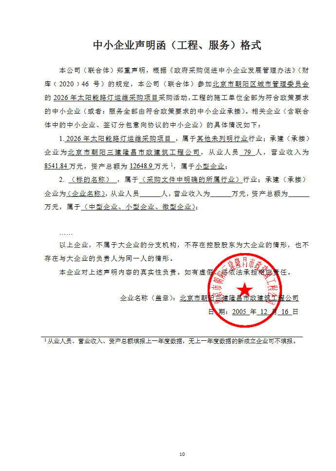 | 北京市朝阳三建隆昌市政建筑工程公司 | * | ***万元 | ***万元 | 负责对全区约****基太阳能路灯开展运维工作,具体包括日常维护和断路器专项应急消隐检修养护等运维管理工作。 |
