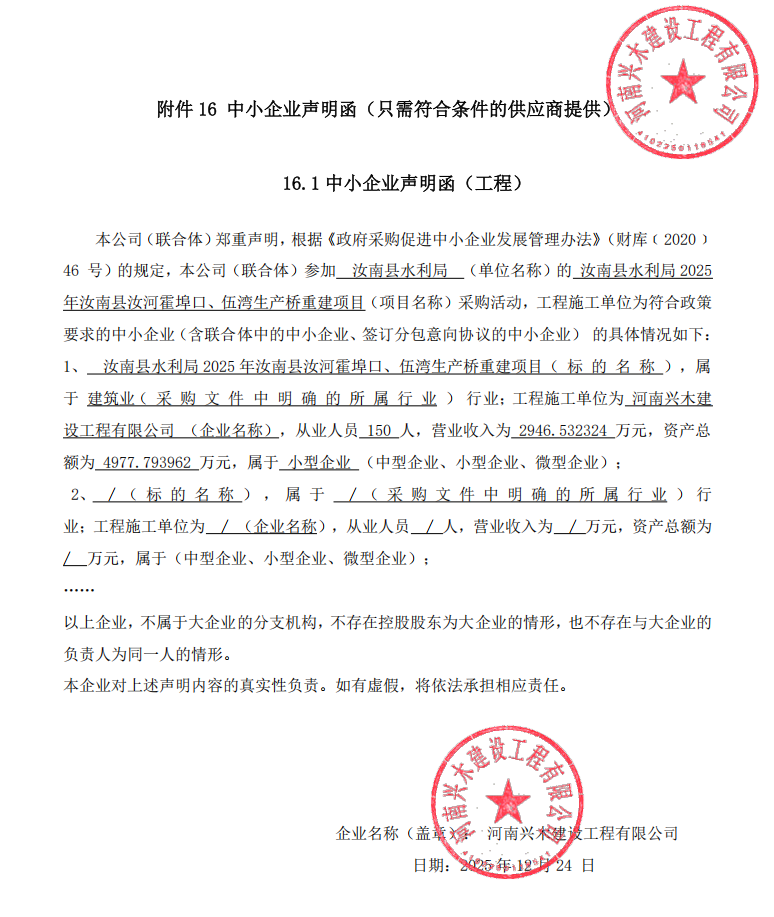 汝南县水利局2025年汝南县汝河霍埠口、伍湾生产桥重建项目-成交公告