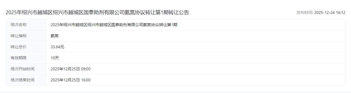 2025年绍兴市越城区绍兴市越城区国泰助剂有限公司氨氮协议转让第1期转让公告