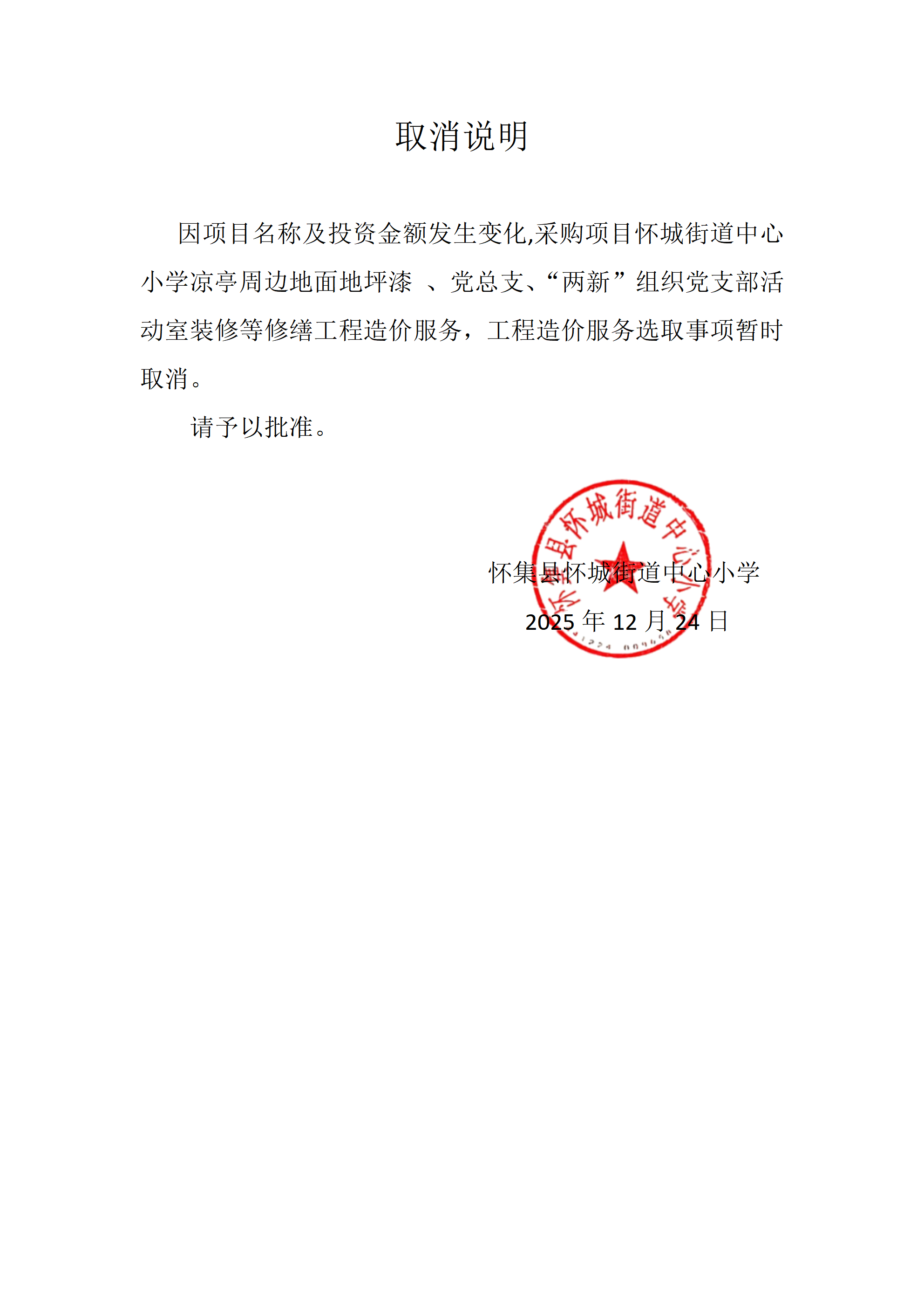 因项目名称及投资金额发生变化,采购项目怀城街道中心小学凉亭周边地面地坪漆 、党总支、“两新”组织党支部活动室装修等修缮工程造价服务,工程造价服务选取事项暂时取消。