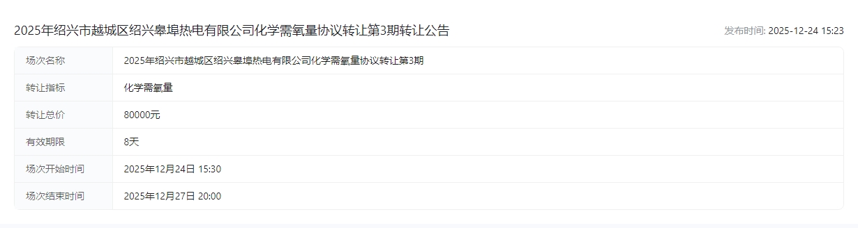 2025年绍兴市越城区绍兴皋埠热电有限公司化学需氧量协议转让第3期转让公告