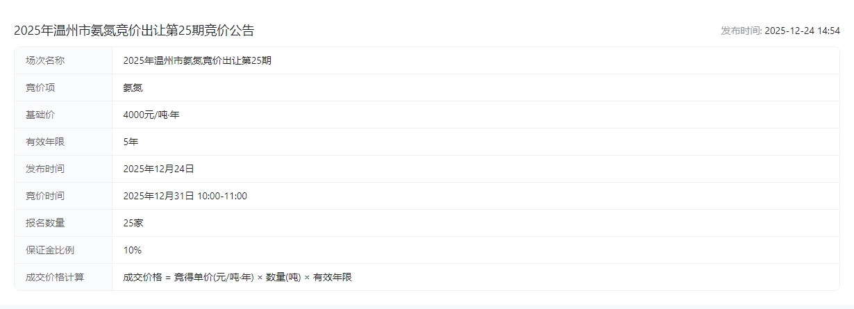 2025年温州市氨氮竞价出让第25期竞价公告