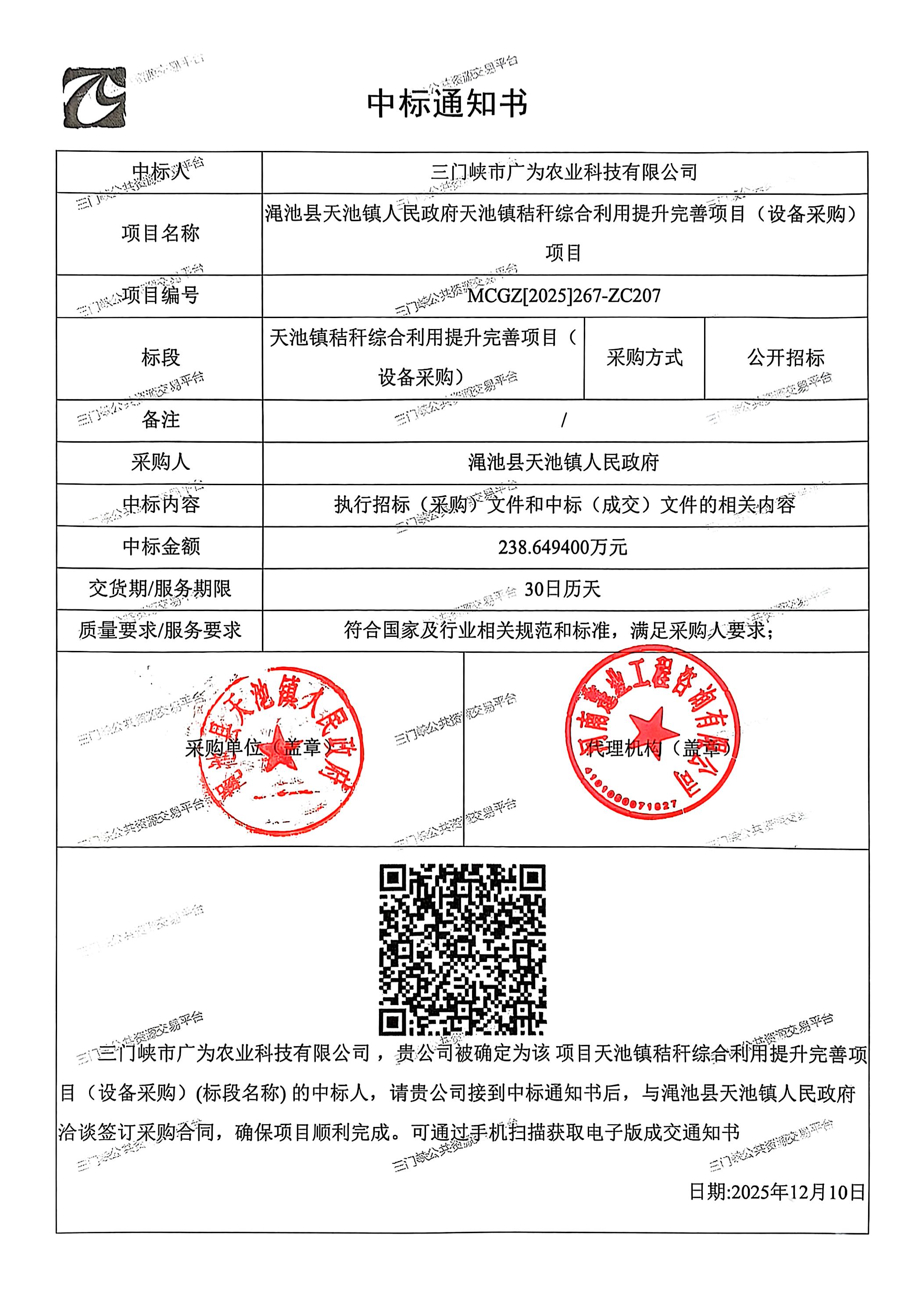 渑池县天池镇人民政府天池镇秸秆综合利用提升完善项目(设备采购)项目