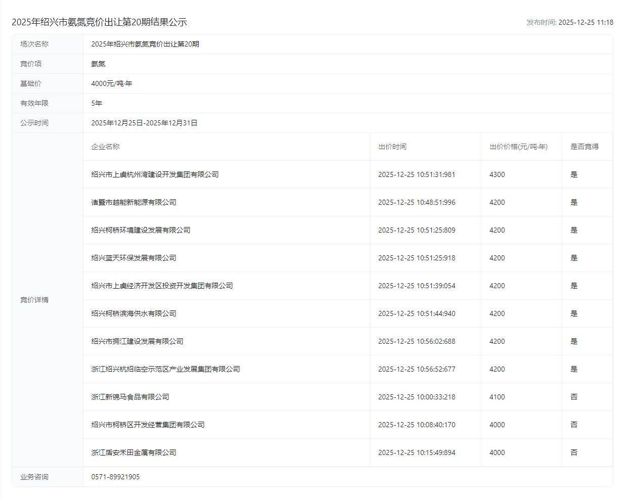 2025年绍兴市氨氮竞价出让第20期结果公示