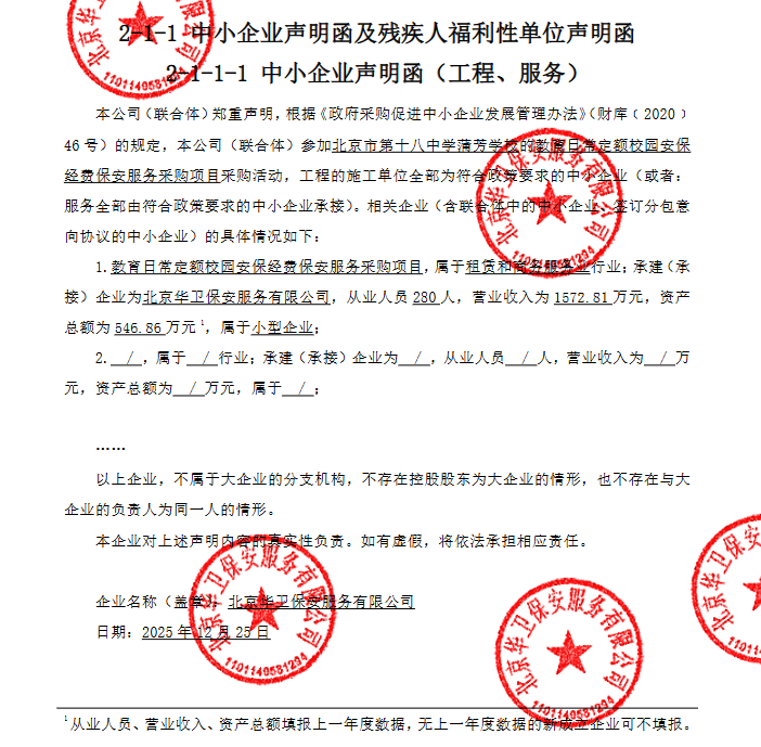 | 北京华卫保安服务有限公司 | 北京市丰台区长辛店杜家坎*号**号楼二层*** | ****************** | ***.**** 万元 | 评审总得分(综合评分法): **.* 分 |