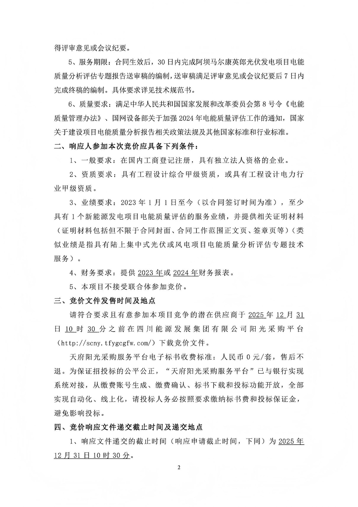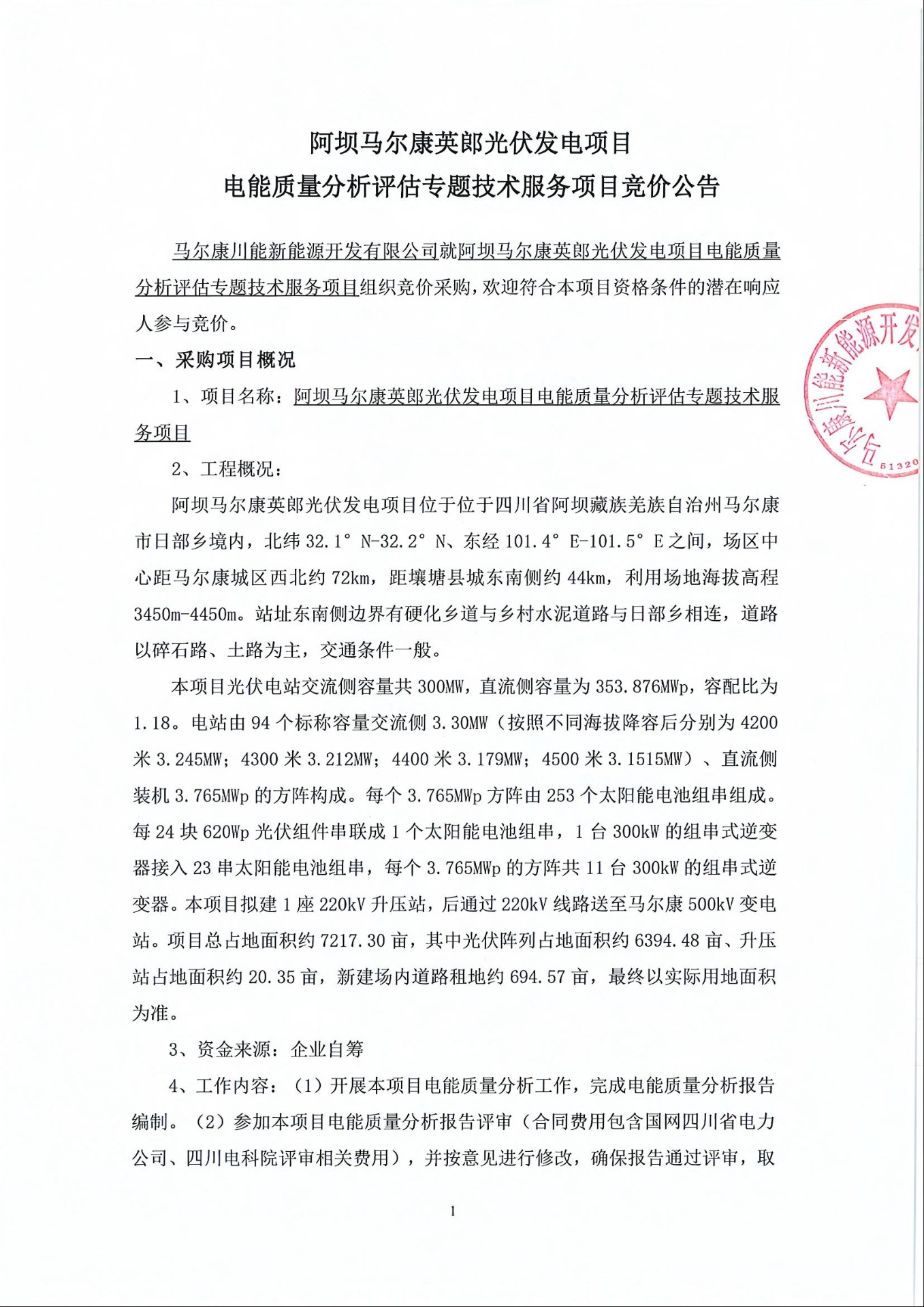 马尔康川能新能源开发有限公司就阿坝马尔康英郎光伏发电项目电能质量分析评估专题技术服务项目组织竞价采购,欢迎符合本项目资格条件的潜在响应人参与竞价。