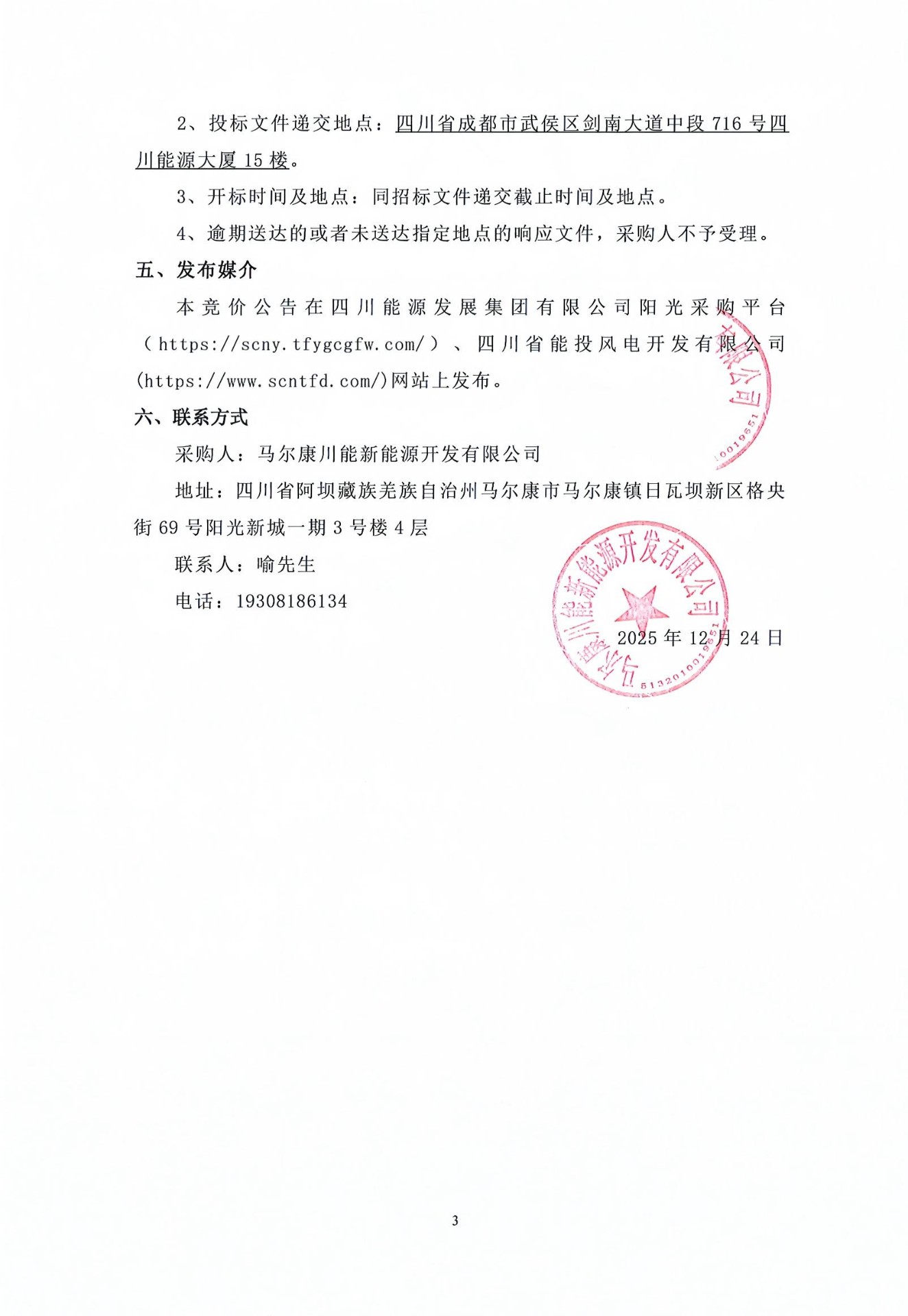 本竞价公告在四川能源发展集团有限公司阳光采购平台(*****://****.********.***/)、四川省能投风电开发有限公司(*****://***.******.***/)网站上发布。