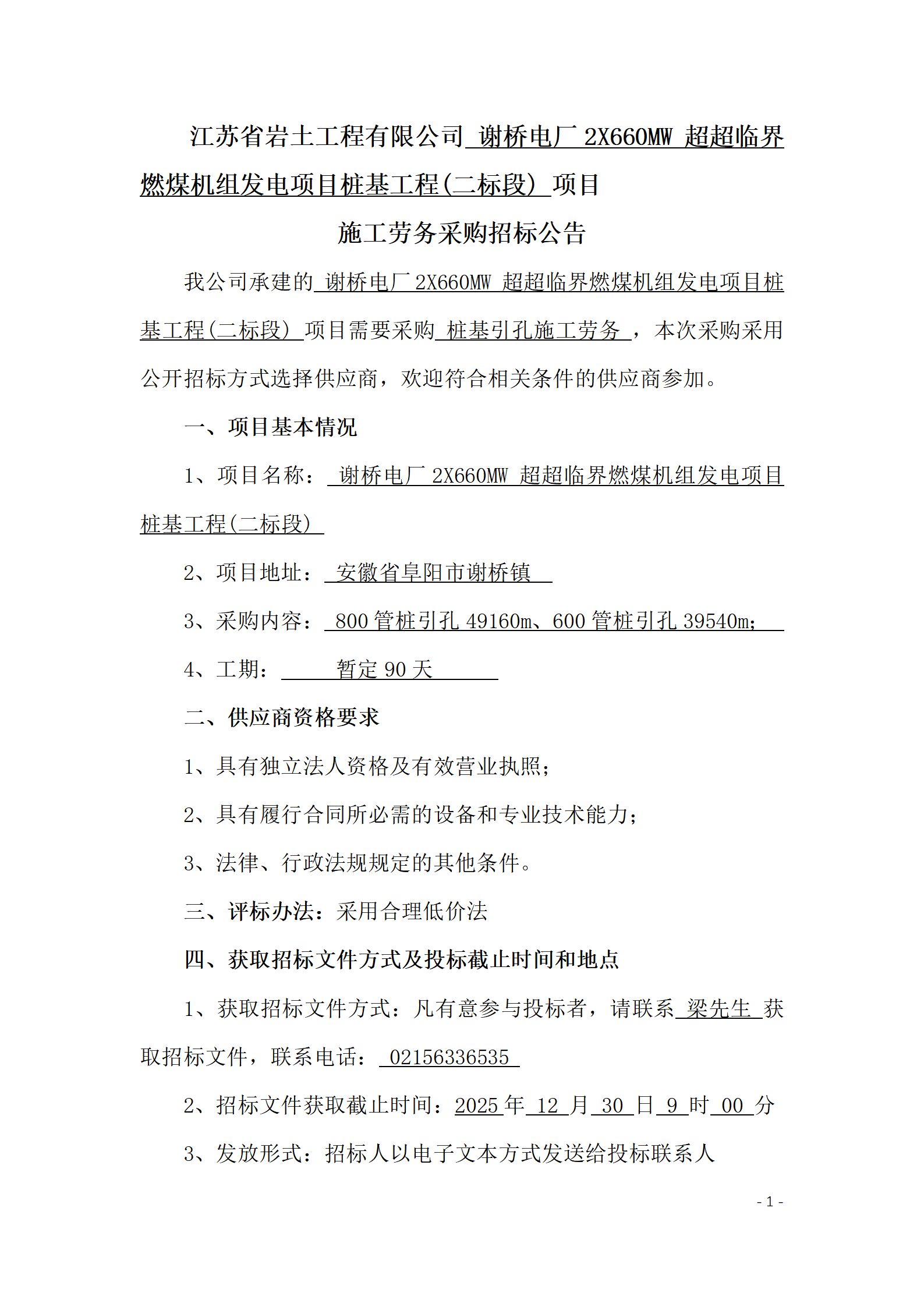 江苏省岩土工程有限公司 谢桥电厂******* 超超临界燃煤机组发电项目桩基工程(二标段) 项目施工劳务采购招标公告