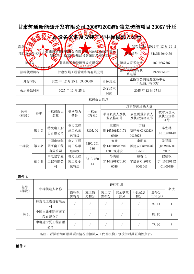 [市本级]甘肃辉通新能源开发有限公司300MW1200MWh独立储能项目330KV升压站设备采购及安装工程中标候选人公示交易结果公示