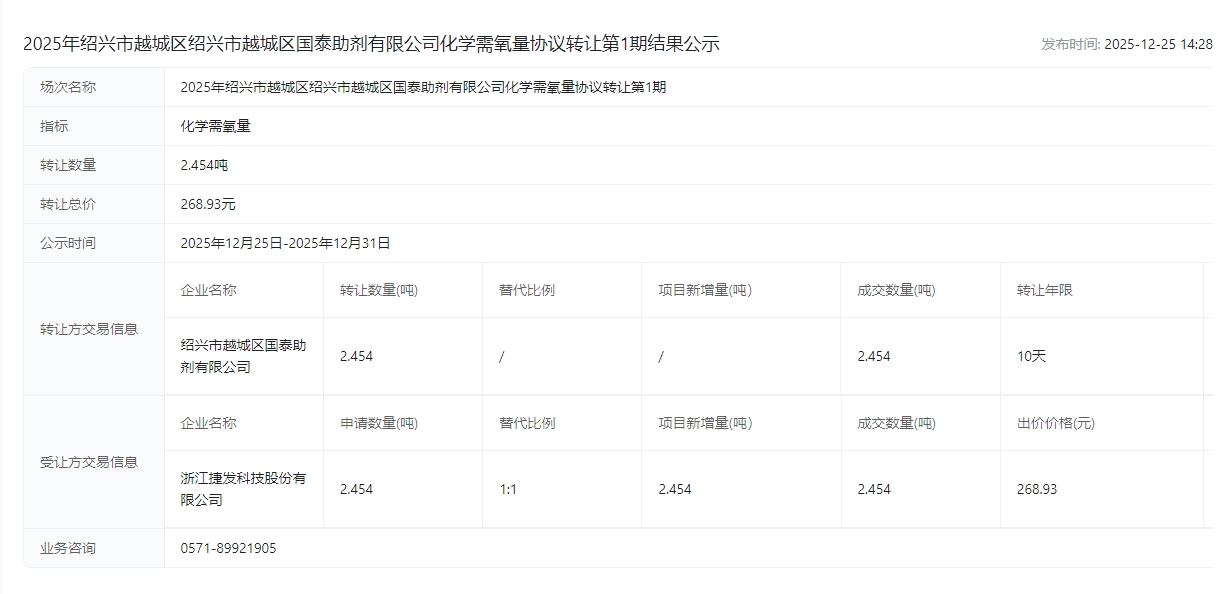 2025年绍兴市越城区绍兴市越城区国泰助剂有限公司化学需氧量协议转让第1期结果公示