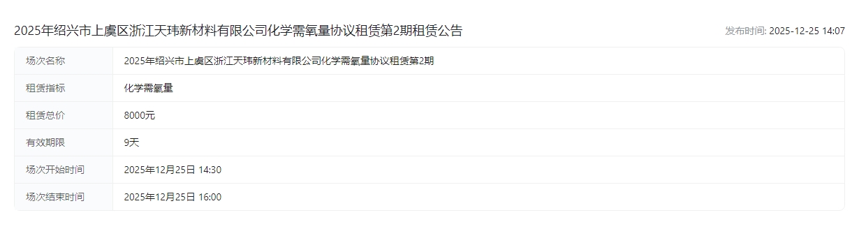2025年绍兴市上虞区浙江天玮新材料有限公司化学需氧量协议租赁第2期租赁公告