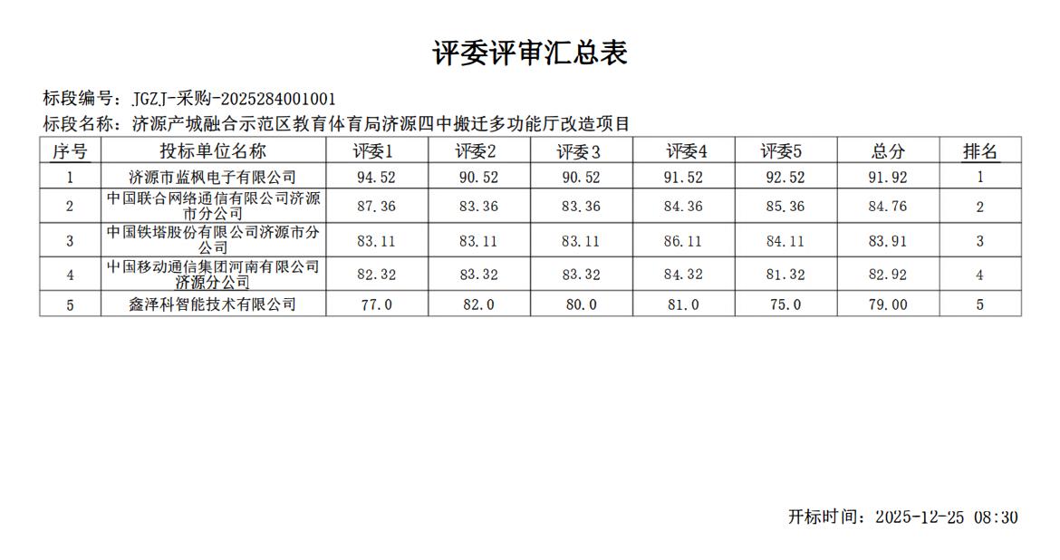 济源产城融合示范区教育体育局济源四中搬迁多功能厅改造项目*中标公告