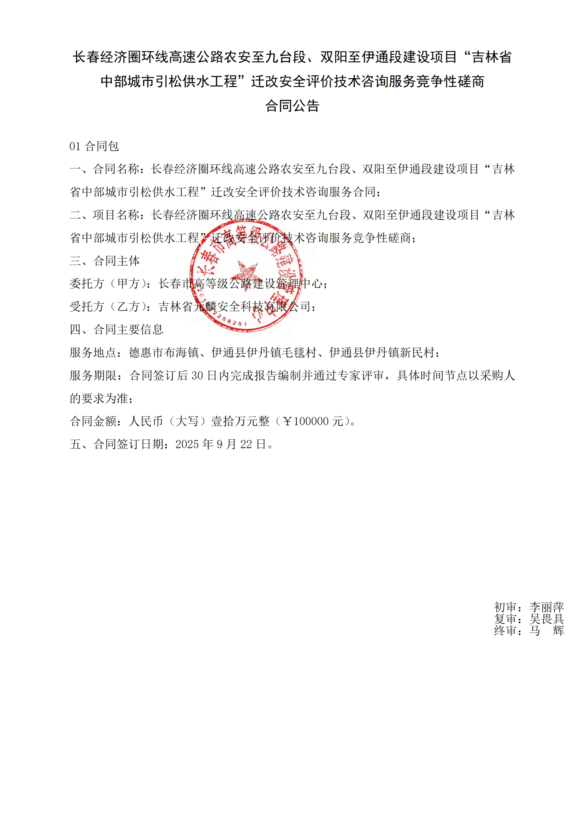 长春经济圈环线高速公路农安至九台段、双阳至伊通段建设项目"吉林省中部城市引松供水工程"迁改安全评价技术咨询服务竞争性磋商合同公告