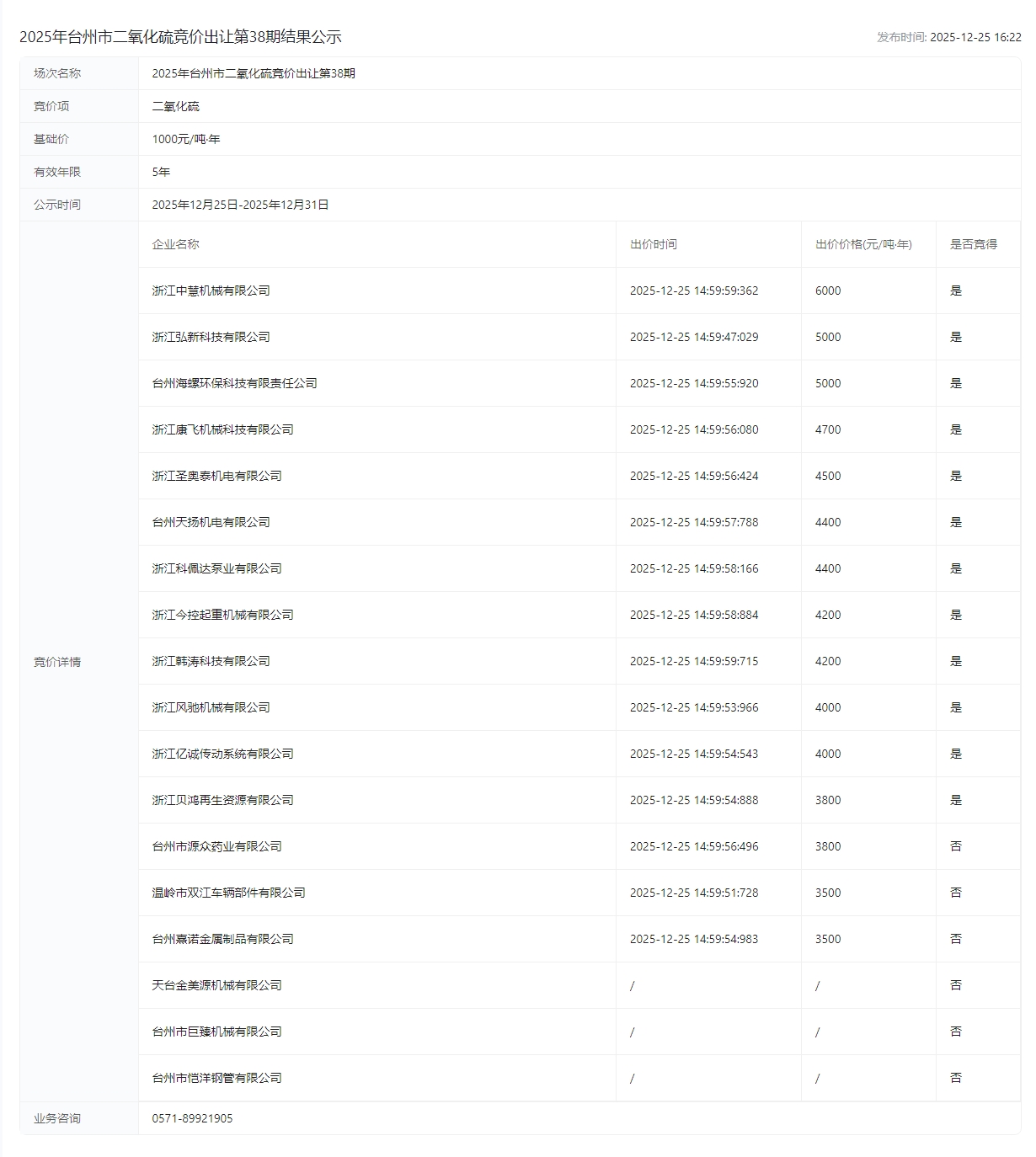 2025年台州市二氧化硫竞价出让第38期结果公示