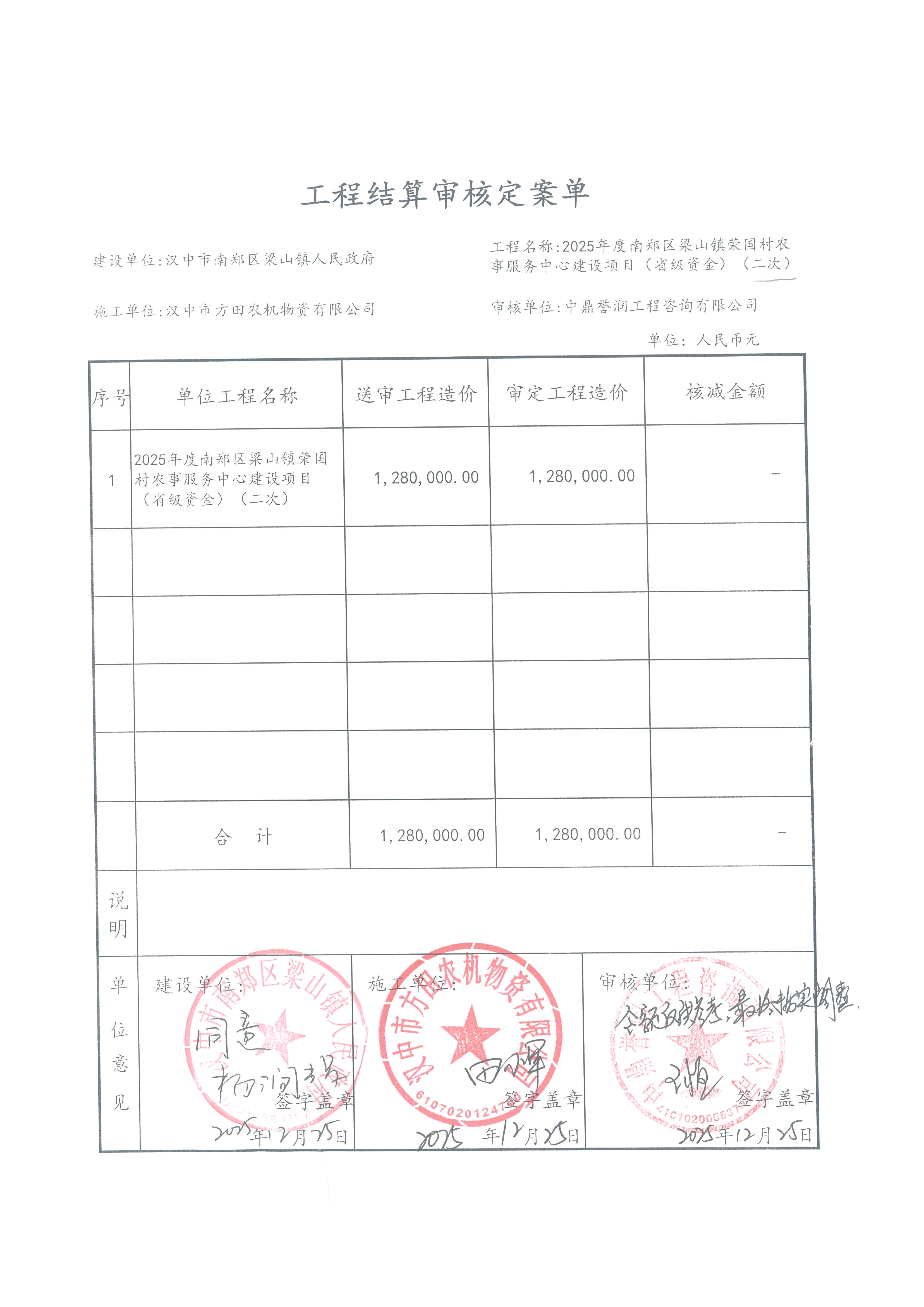 汉中市南郑区梁山镇人民政府2025年度南郑区梁山镇荣国村农事服务中心建设项目(省级资金)(二次)政府采购合同公告