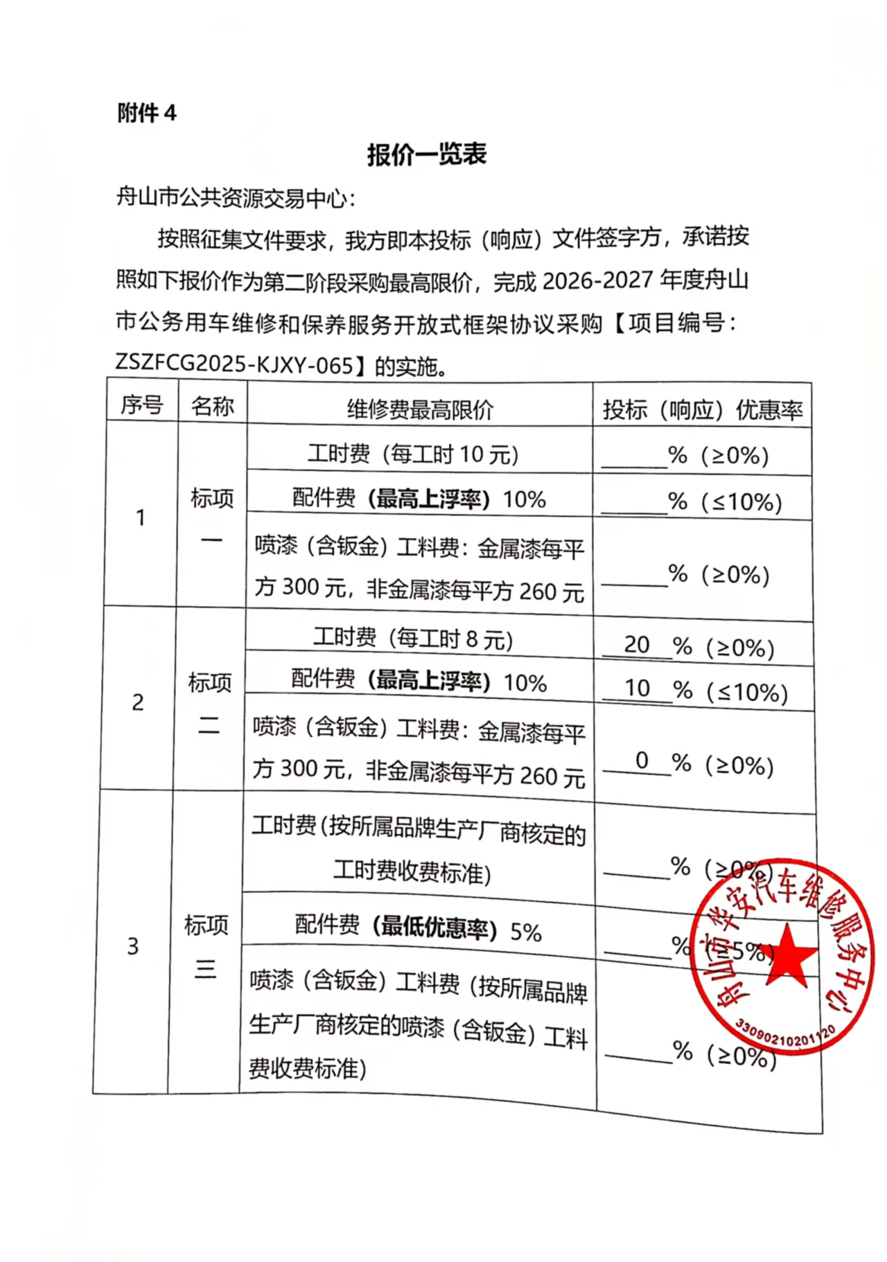 舟山市华安汽车维修服务中心入围2026-2027年度舟山市公务用车维修和保养服务开放式框架协议采购项目的结果公告