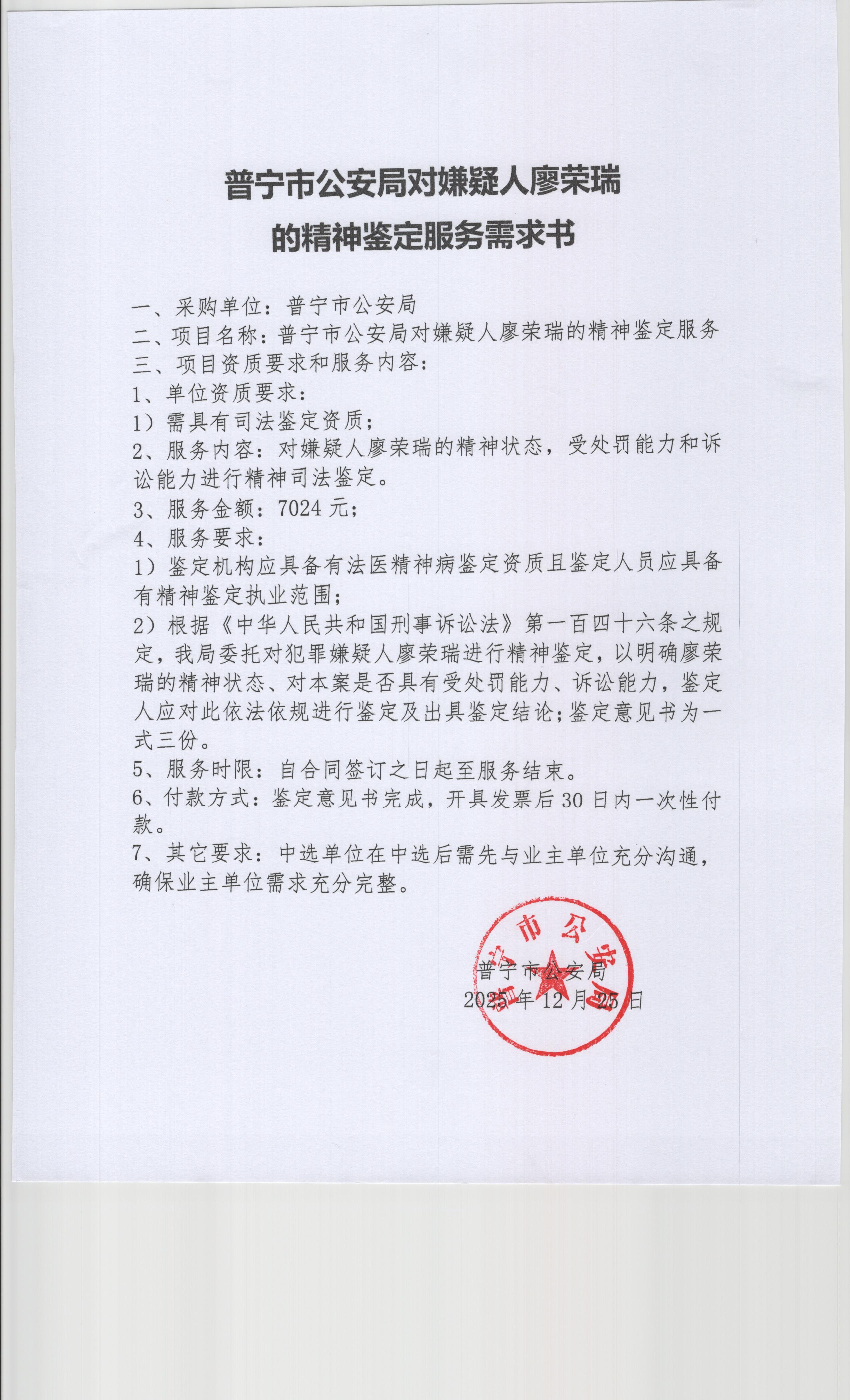 普宁市公安局对嫌疑人廖荣瑞的精神鉴定服务采购公告