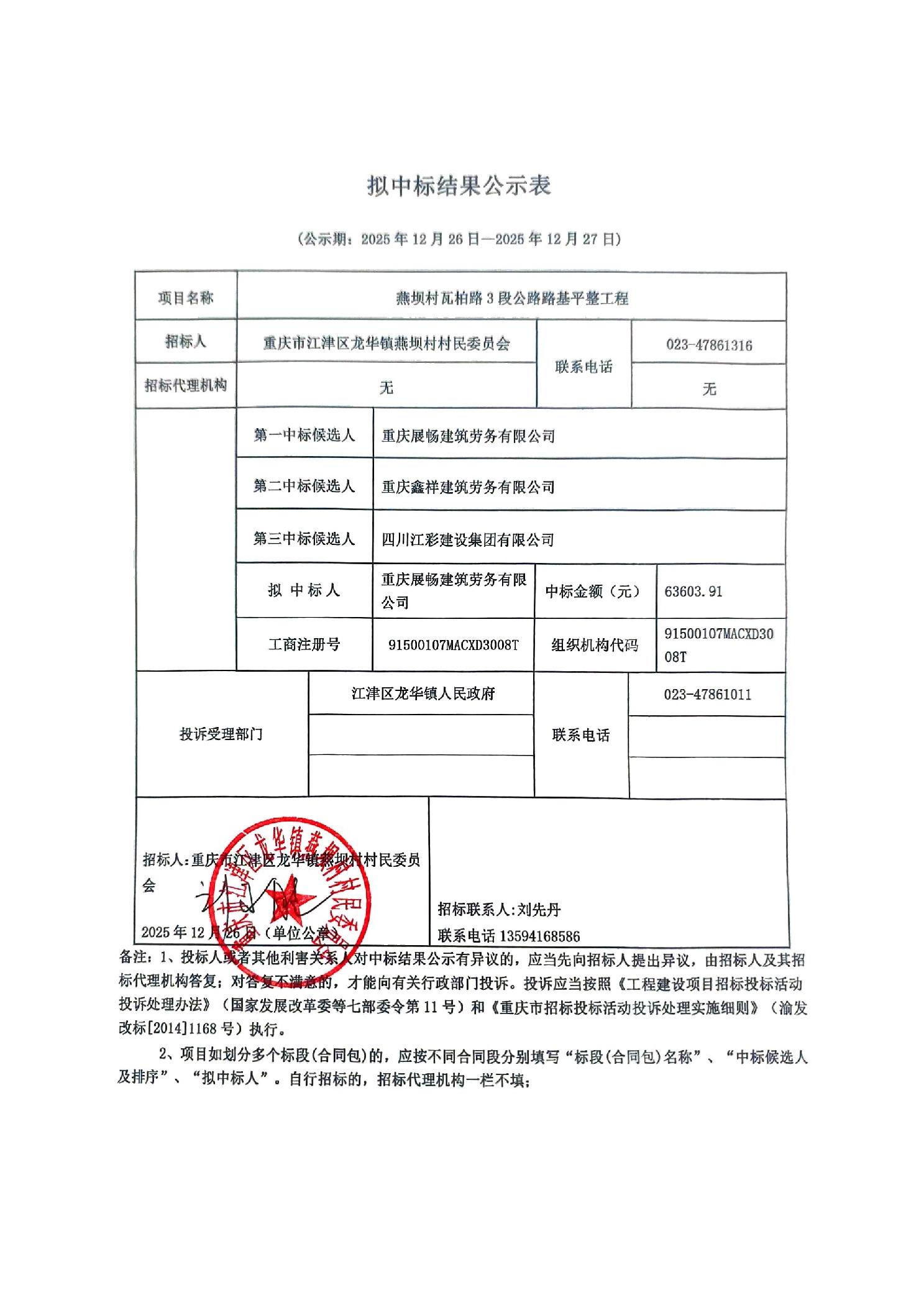 燕坝村瓦柏路3段公路路基平整工程拟中标结果公示表