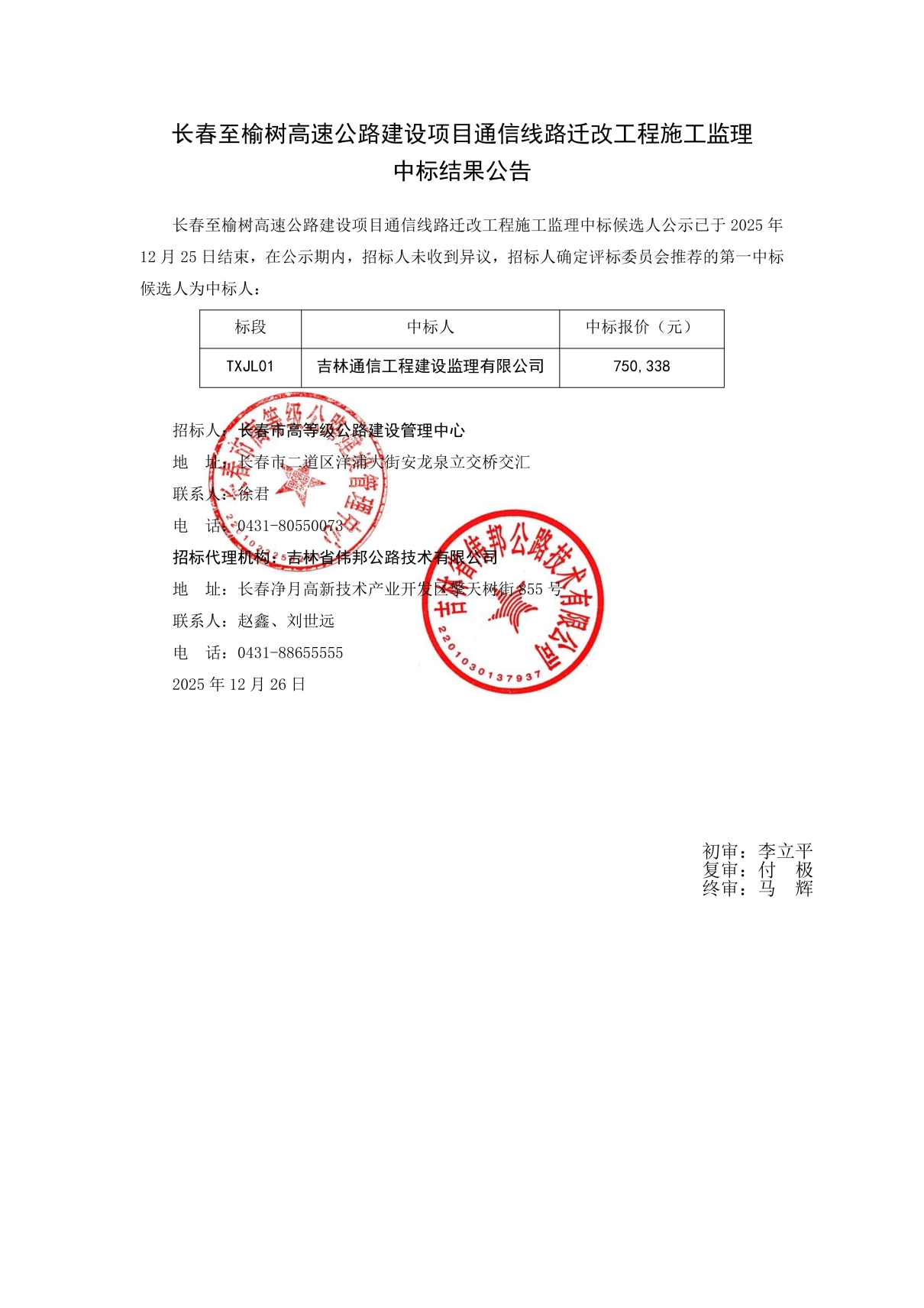 长春至榆树高速公路建设项目通信线路迁改工程施工监理招标中标结果公告
