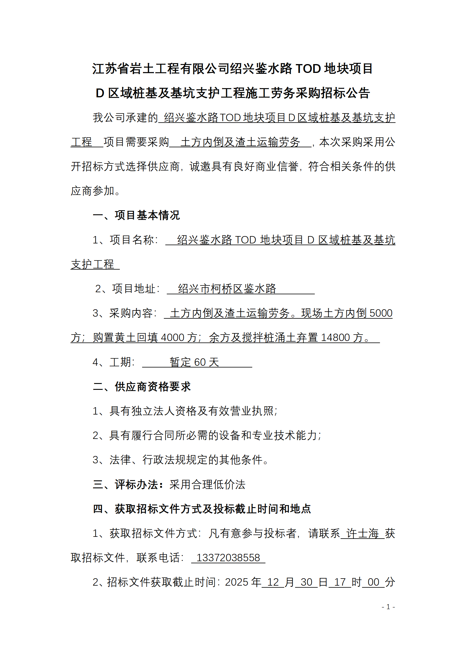 江苏省岩土工程有限公司绍兴鉴水路TOD地块项目D区域桩基及基坑支护工程施工劳务采购招标公告