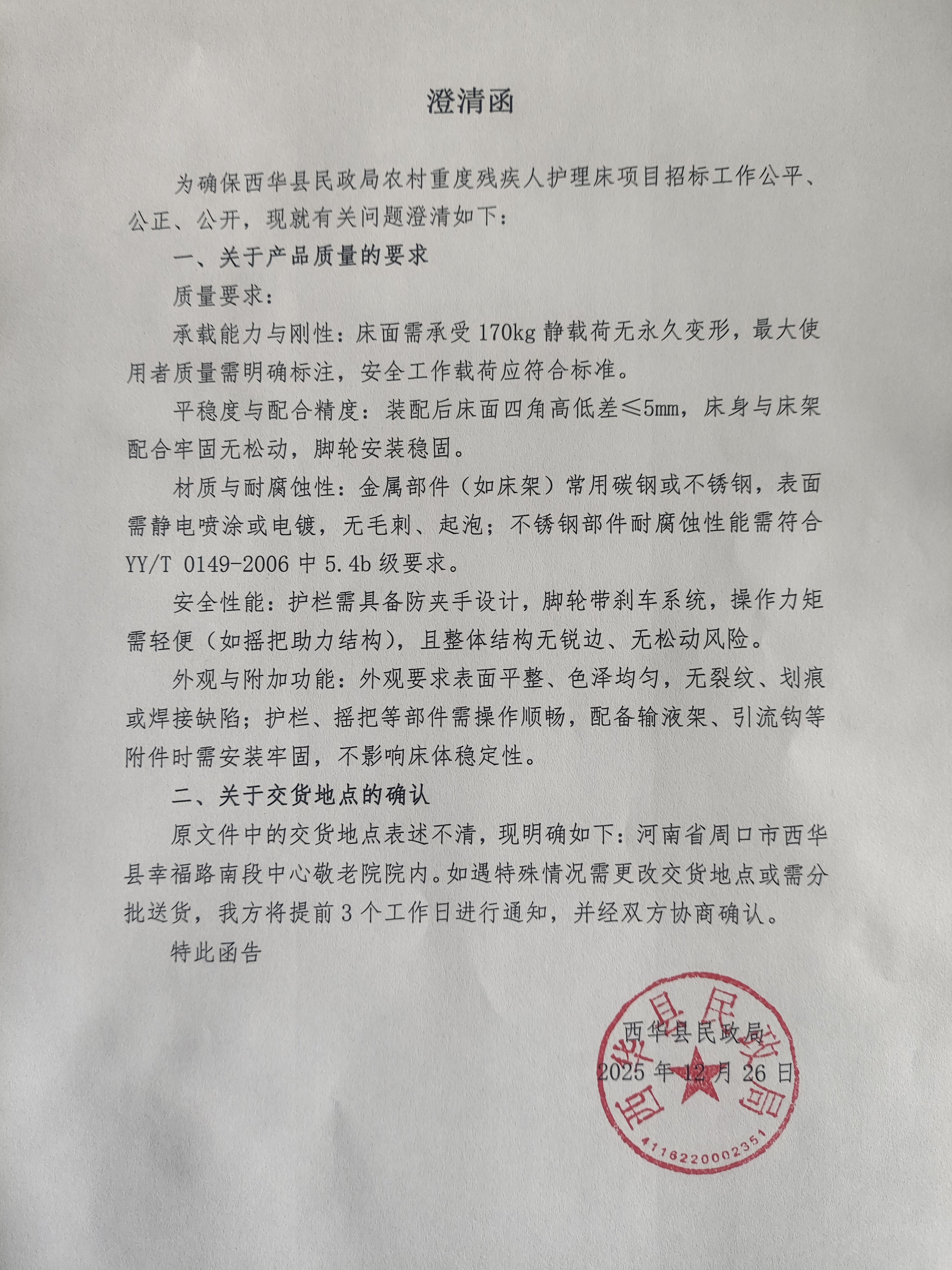 西华县民政局农村重度残疾人护理床项目*澄清公告