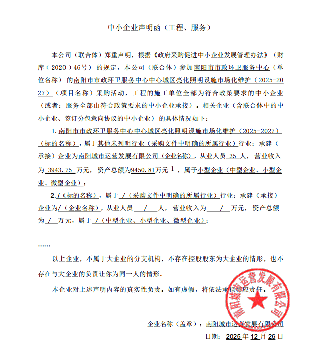 南阳市市政环卫服务中心中心城区亮化照明设施市场化维护(2025-2027)项目-中标公告