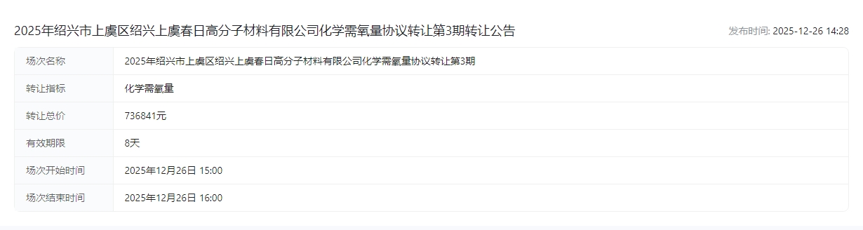2025年绍兴市上虞区绍兴上虞春日高分子材料有限公司化学需氧量协议转让第3期转让公告交易公告