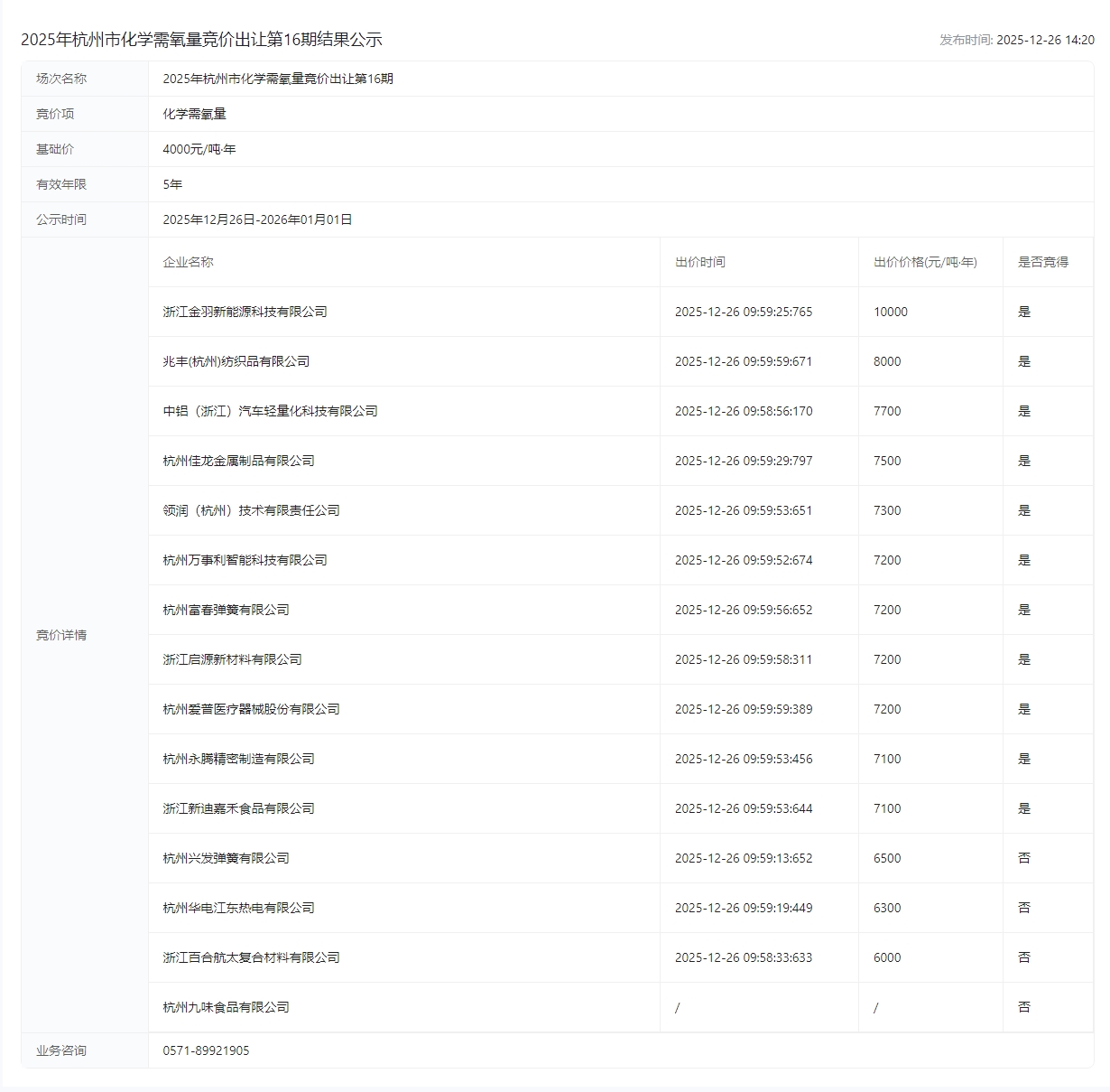 2025年杭州市化学需氧量竞价