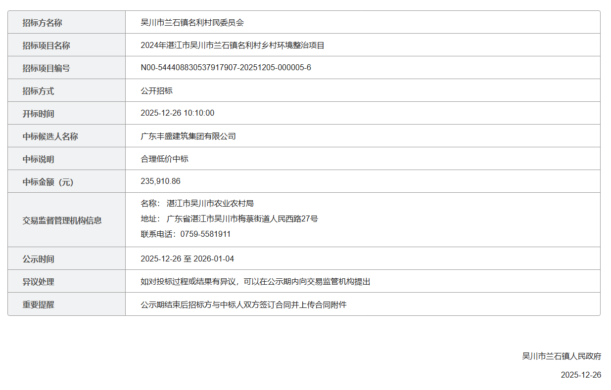 2024年湛江市吴川市兰石镇名利村乡村环境整治项目中标候选人公示