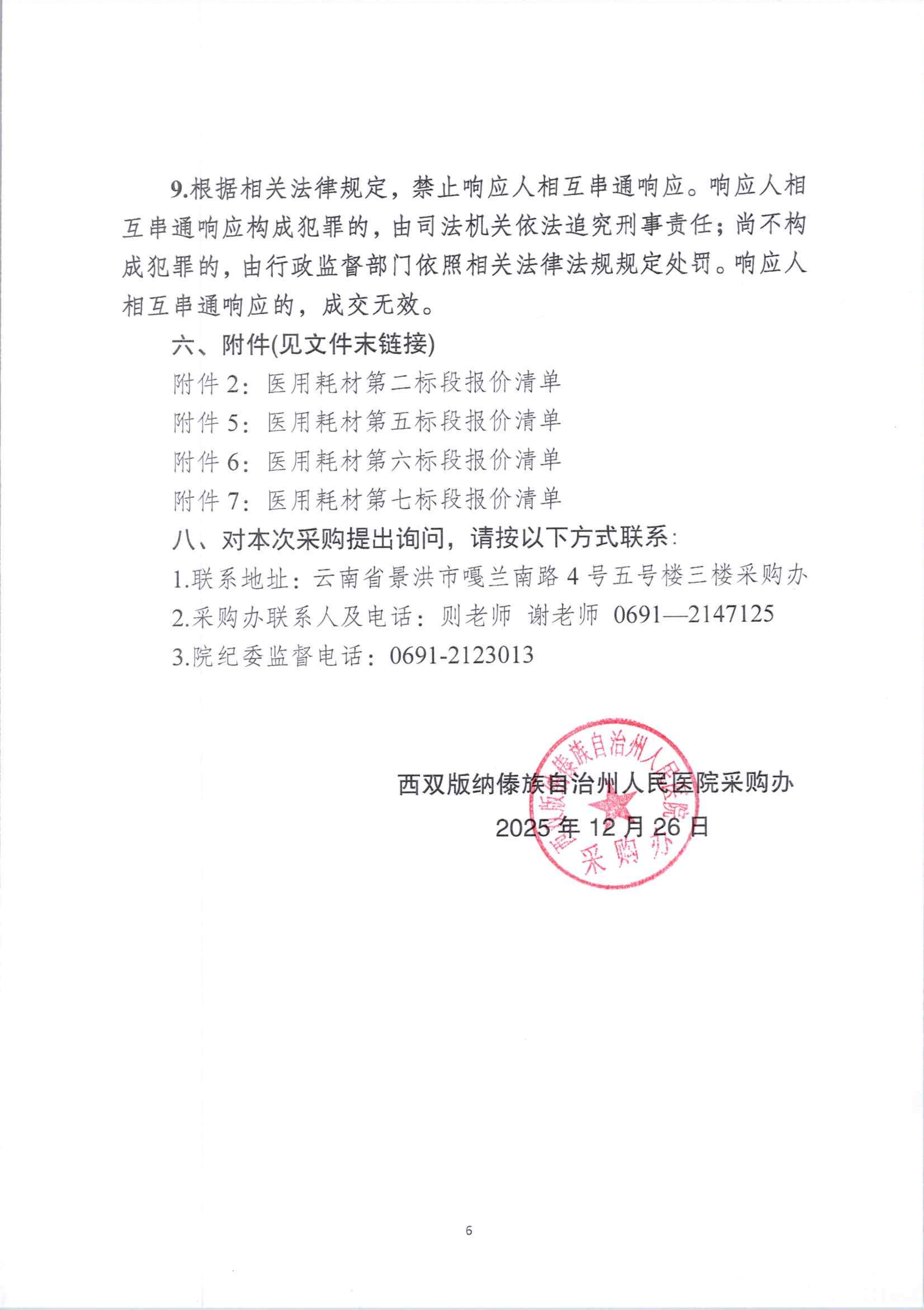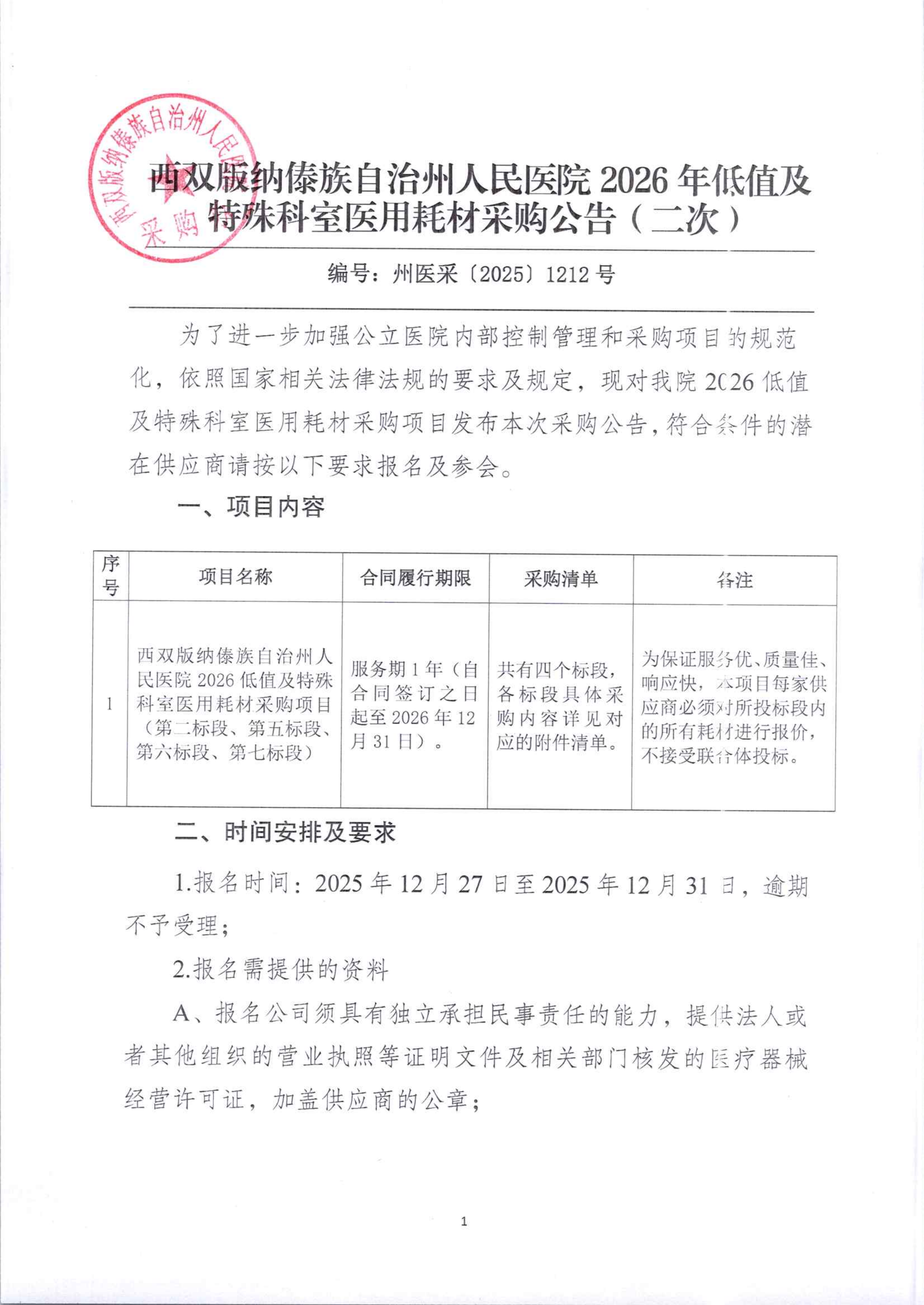 西双版纳傣族自治州人民医院2026年低值及特殊科室医用耗材采购公告(二次)