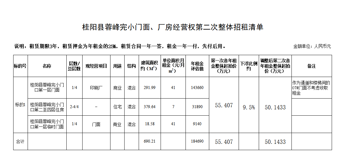桂阳县蓉峰完小门面、厂房经营权第二次整体招租(郴公产告字〔****〕第***号)