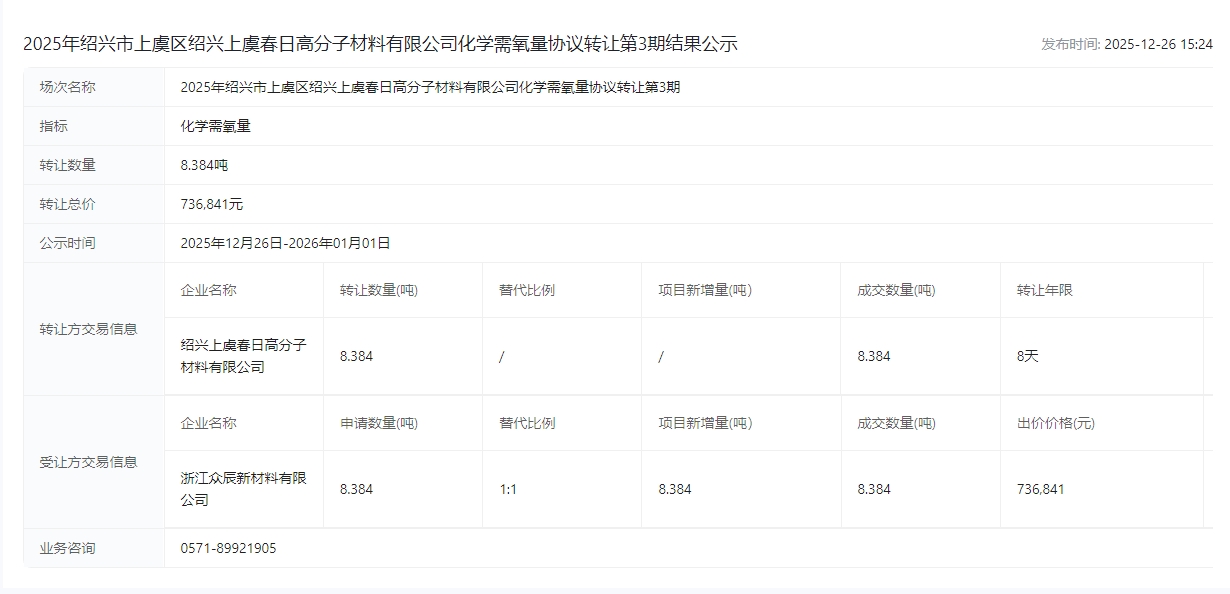 2025年绍兴市上虞区绍兴上虞春日高分子材料有限公司化学需氧量协议转让第3期结果公示成交公示