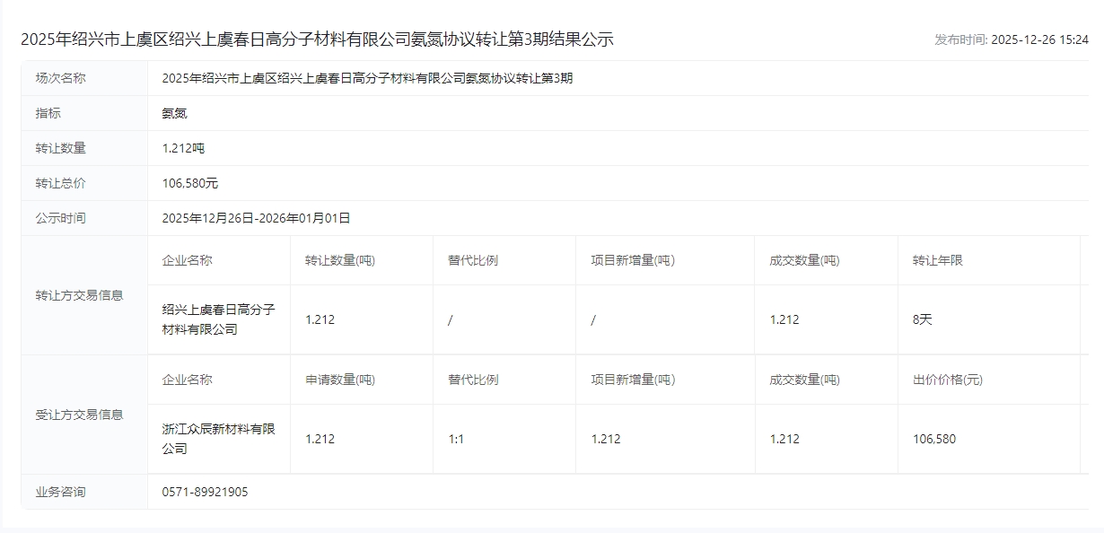 2025年绍兴市上虞区绍兴上虞春日高分子材料有限公司氨氮协议转让第3期结果公示成交公示
